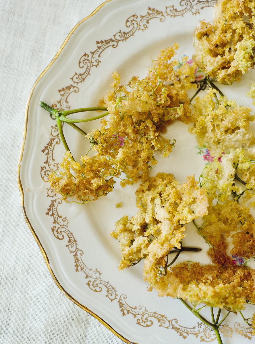 - Neem 10 schermen vlier en doop ze even in een papje van 100 gram (spelt)meel, 1 ei en een scheutje melk of bruisend bronwater.
