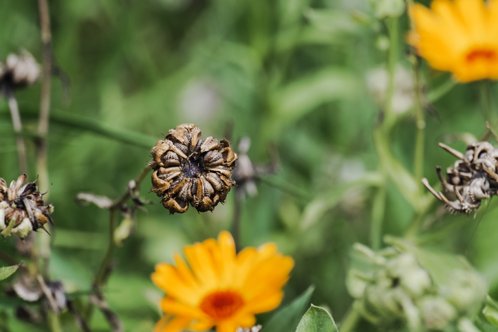 Ook de eenjarige goudsbloem (Calendula officinalis) zaait zichzelf uit. Oogst de bruine bloemharten als ze zijn ingedroogd. Zaaien kan dan weer in april. Lees hier ons uitgebreide artikel over goudsbloem.