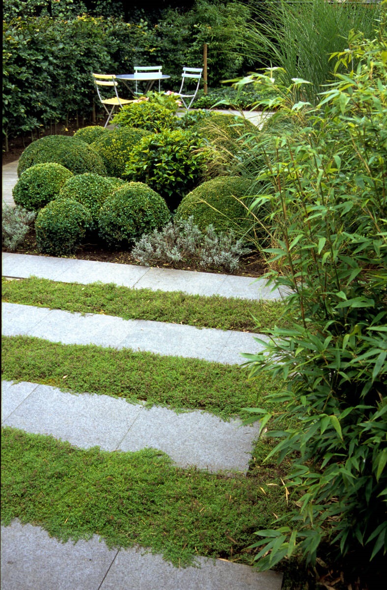Wissel stroken bestrating af met stroken groen. Zo creëer je een rainproof tuin met ook nog voldoende plek voor een gezellig terras, zoals op bovenstaande foto, waar stroken Belgisch hardsteen om en om liggen met stroken loopkamille (Chamaemelum nobile ‘Treneague’). De border halverwege de tuin vormt een welkome onderbreking.