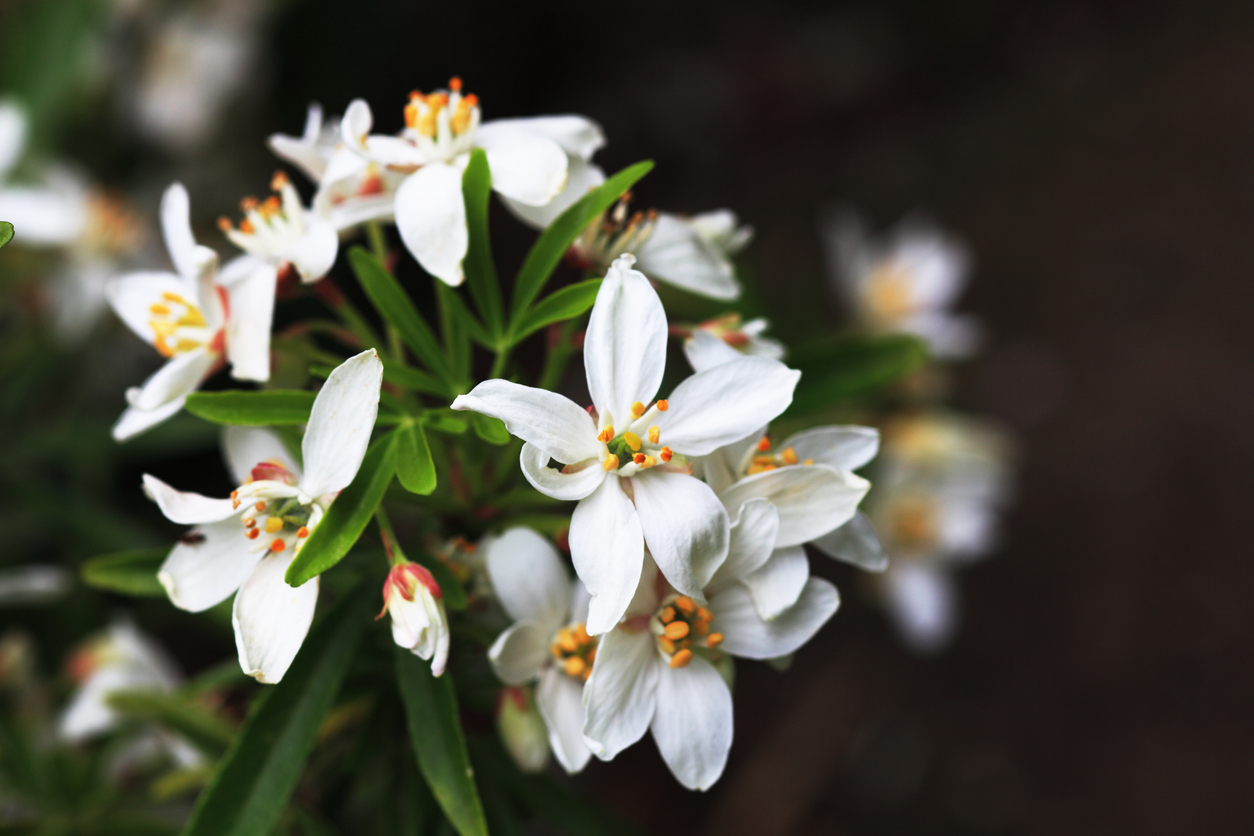 • Choisya ternata ‘White Dazzler’, een wintergroene heester met geurende witte bloemetjes in april-mei.