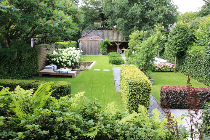 Tanja kleurde de vlakken vooral groen in: stukken gazon, strakke beukenhagen en rond gesnoeide vormen struik-klimop wisselen elkaar af. Smalle paden van het grijze Ardenner split zorgen voor een koel contrast, net als de terrassen van Aziatisch hardsteen. Bij de vijver golft een strook witte hortensia ‘Annabelle’. “Ik word heel gelukkig van tuinieren binnen de strakke lijnen. Dankzij die vlakverdeling blijft het werk overzichtelijk. Dat was ook wel een wens. Een keer in de zoveel tijd ren ik rond met de elektrische heggenschaar om een haag te snoeien. Dan weer hark ik het grind of maai ik het gazon. Zo rond ik voor mijn gevoel telkens een onderdeel af, heel prettig.”