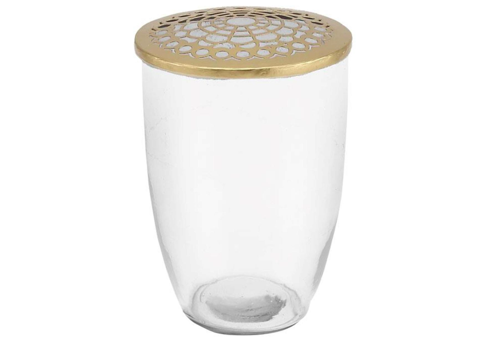 Vaas ‘A simple mess’ oogt fijn luchtig want van glas. Het bijzondere aan deze vaas: hij komt met een goudkleurig dekseltje met een patroon van gaatjes. Een paar bloemen staan dus al prachtig, omdat je ze in de gewenste positie kan rangschikken. €29,95 | 16l x 11b x 16h | Te koop bij verschillende webshops zoals Bol.com