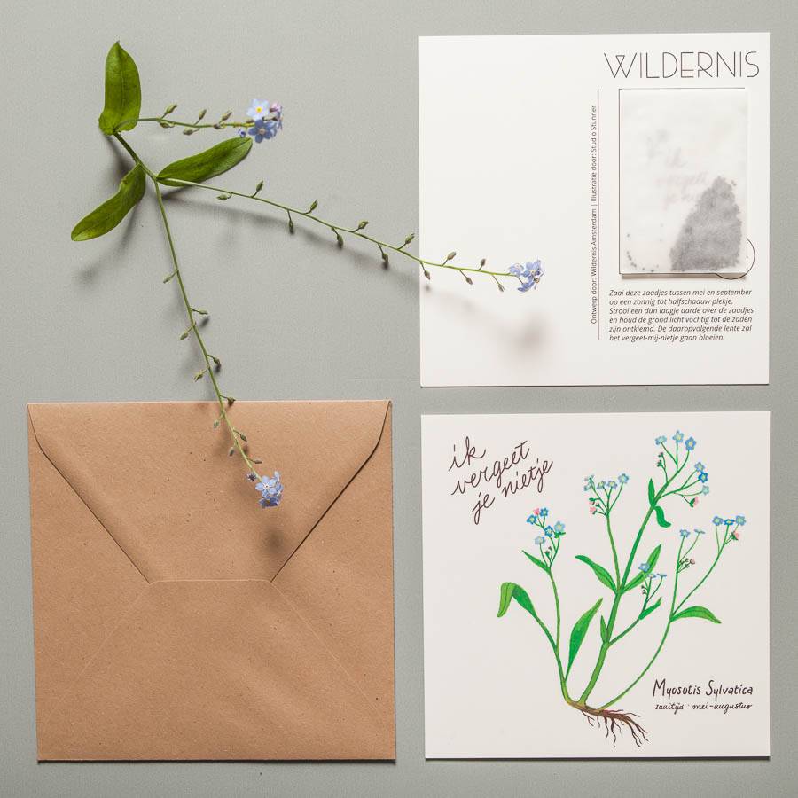 Het ansichtkaartje is al prachtig want van de hand van Studio Stunner. Erbij zitten zaadjes van het bos-vergeet-me-nietje ‘Myosotis sylvatica’ – die tot en met augustus gezaaid kunnen worden. Je moet dit gelukskaartje wel eerst even bij jezelf laten bezorgen om ‘m te schrijven. Of je koopt ‘m in de winkel van Wildernis in Amsterdam. Prijs: €4,95 + eventueel verzendkosten van €4 | Wildernisamsterdam.nl
