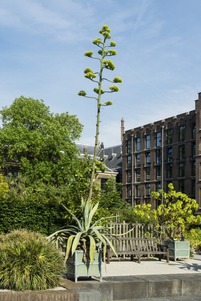 Bijzonder nieuws van de Hortus botanicus Leiden: na zestig jaar staan vier imposante Agave americana achter de Clusiustuin allemaal in bloei! Ze hebben een bloemstengel van wel een paar meter hoog, dus je kunt ze bij een bezoek niet missen.