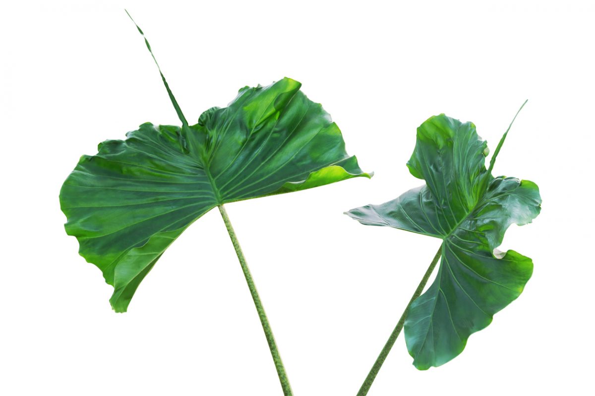 Green Leaves of Alocasia 'Sting Ray', Elephant Ear Plant Isolated on White Background
