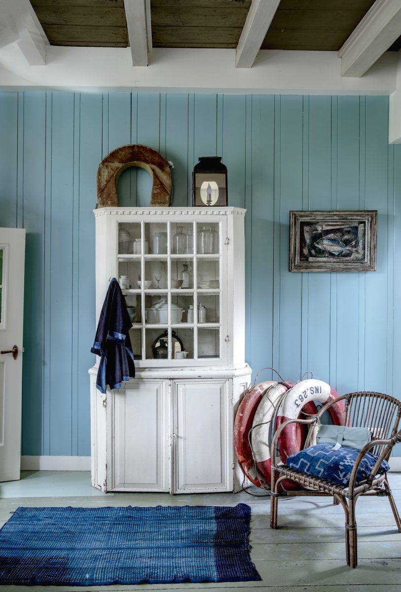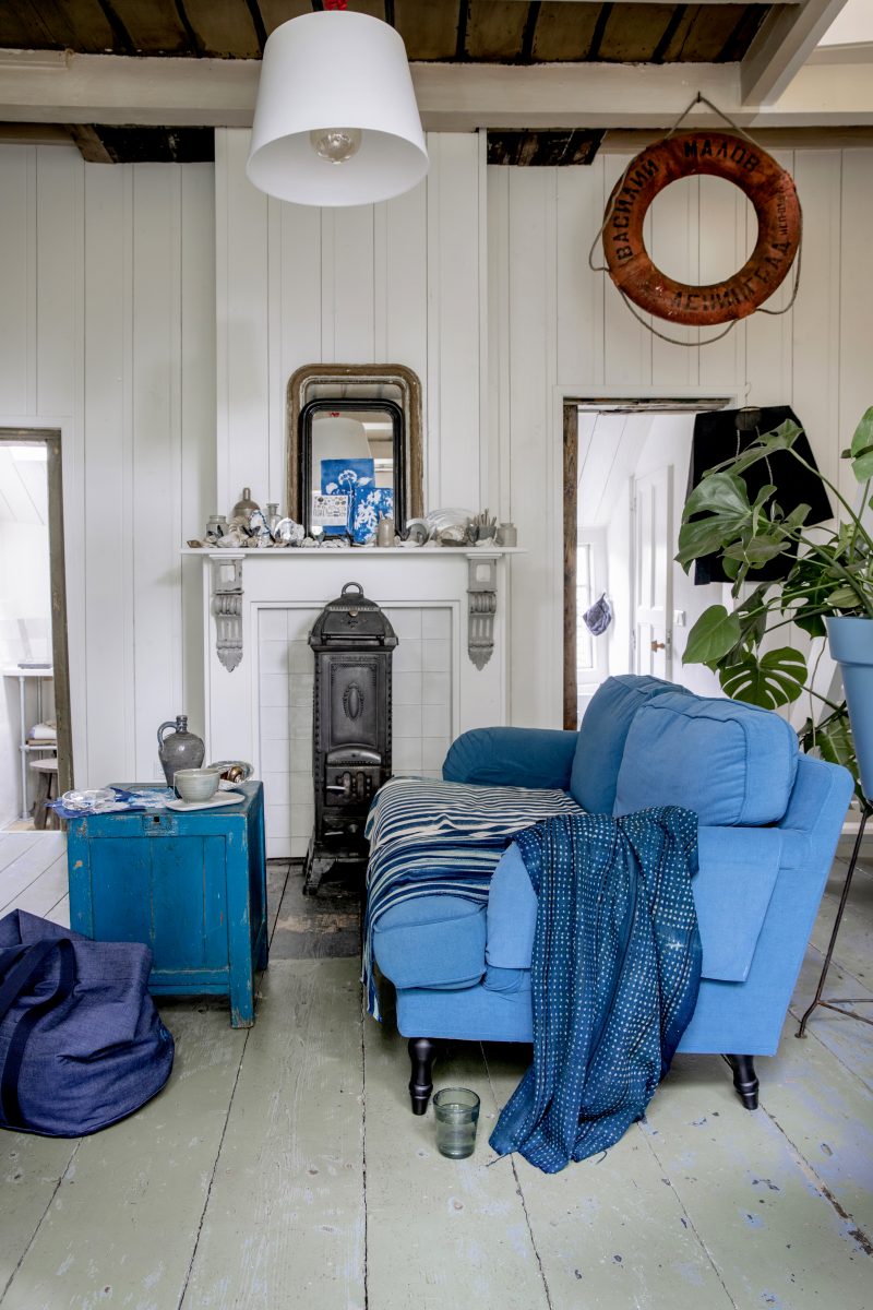 De renovatie kostte een jaar. Toen kon Het Grote Inrichten beginnen. Voor Elina stond één ding vast: ook het kleurenpalet moest traditioneel zijn, dus blauw/wit. Met de blauwe voordeur als uitgangspunt ging ze naar de plaatselijke bouwmarkt en liet ze verf mengen in uiteenlopende blauwtinten die ze gebruikte voor muren, vloeren en verschillende meubels. Ze stylede de ruimtes af met zeeschatten en brocante vondsten die een link hebben met de zee. Dat ze tien jaar geleden een vintagewinkel runde met unieke antieke items, kwam goed van pas. De ingelijste foto in de hal en de boei onder aan de kapstok komen nog uit haar winkelinboedel van die tijd, net zoals de Franse spiegels op de schoorsteen. De reddingsgordels – afkomstig van oude schepen – zijn uit Eriks collectie die net zo’n liefhebber is van zeeschatten uit vervlogen tijden.