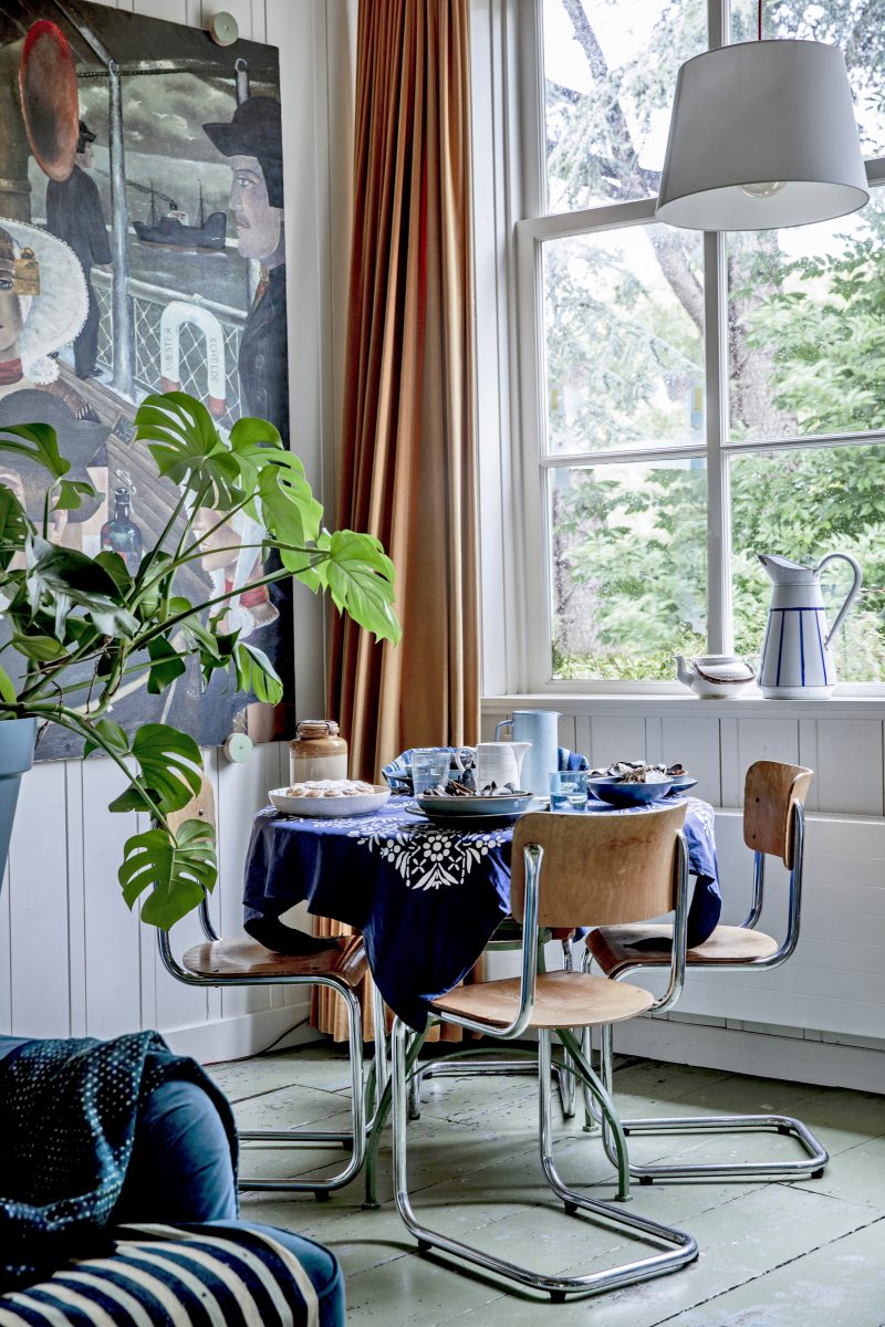 Een klein huis betekent schipperen met ruimte. Daarom kozen Elina en Erik voor een ronde eettafel die weinig plek inneemt. De jaren zeventig Tubax-stoelen (vergelijkbare zijn te vinden op demachinekamer.nl) vormen een warm geheel met de goudbruine fluwelen gordijnen die ze op maat lieten maken. Een ieniemienie-huis wil overigens niet zeggen dat het geen grote gebaren kan gebruiken: opvallend pronkstuk in de woonkamer is het enorme schilderij met markante figuren in Zeeuwse klederdracht. Het is een replica van een schilderij van Reimond Kimpe (1885-1970). Deze in België geboren kunstschilder vestigde zich in Middelburg en staat vooral bekend om zijn werk waarin hij het Zeeuwse leven verbeeldt. Inmiddels heeft Eline haar blauwe monumentale vissershuisje ingeruild voor een andere woning, maar ze denkt met liefde terug aan haar poppenhuisje in Veere.