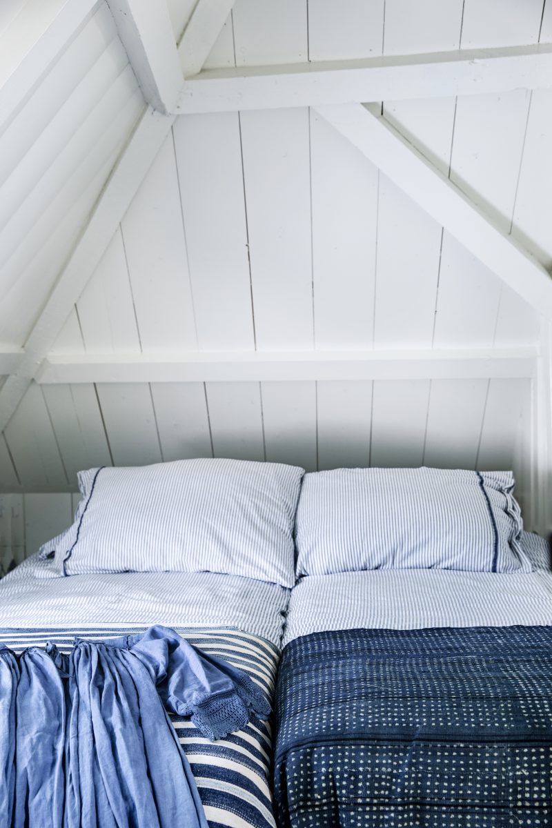 - Elina is ook enthousiast over de creaties van Roos Brancovich, een voormalig modeontwerpster die quilts naaide van oude denim en indigo stoffen verzamelde die ze verwerkte tot kleed – er ligt er eentje voor de witte kast – of gordijn, te zien in de dakkapel. Daarnaast maakt ze cyanotypieën, prachtige cyaanblauwe afdrukken van planten en bloemen op papier. En als je zoals Elina in de ban bent van blauw, zorgen die voor de perfecte finishing touch. Hier lees je meer over Roos Brancovich en cyanotypie: blauwdruktechniek bij het maken van afdrukken van foto’s.