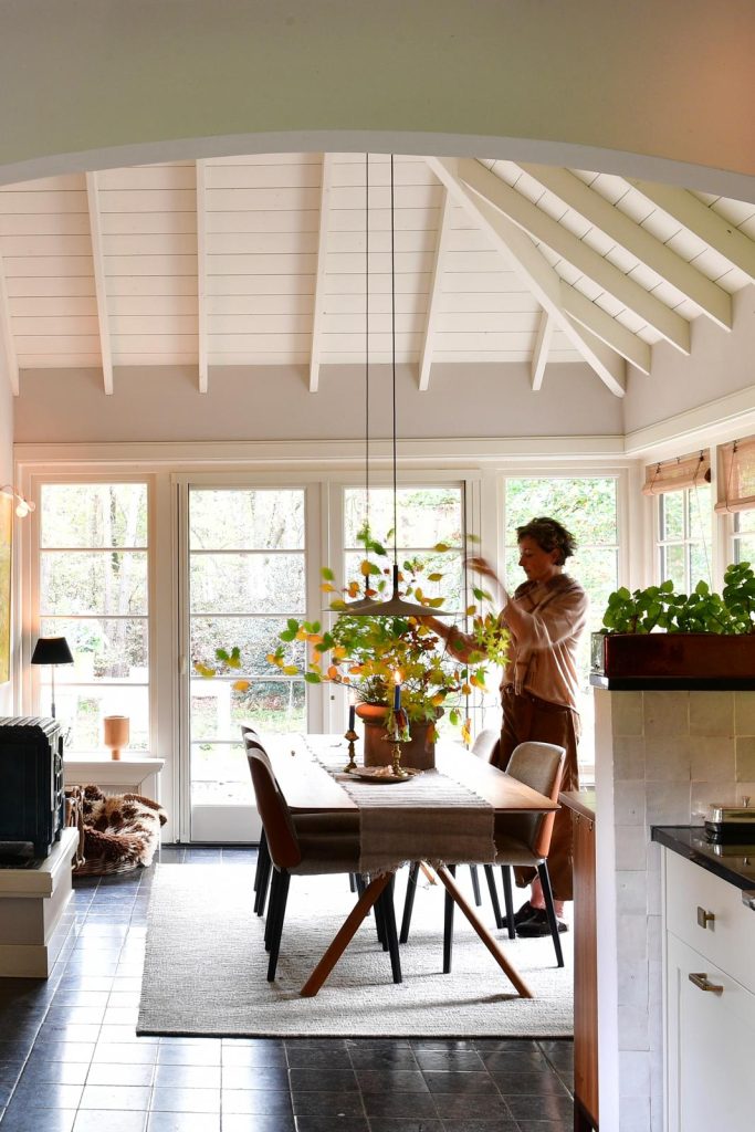 Haar man Herman zat voor werk in het buitenland toen Barbera het Achterhoekse huis ging bezichtigen. ‘Ik denk dat je dit toch even moet zien’, liet ze hem later die dag weten. Een lange oprijlaan – die meteen al goed was voor een ooooh-gevoel – had haar geleid naar een charmant landhuisje, gebouwd in 1920. “Een heel mooi, liefelijk plaatje. De eigenaren hadden er een decennia gewoond, het was van hun opa geweest, wij zijn pas de derde bewoners. Het werd me snel duidelijk dat er veel gedaan moest worden, alles was oud, niet meer goed onderhouden, het interieur was gedateerd en een beetje donker. Maar het zoekcriterium was ‘mooie privéplek’, en die hadden we gevonden.” De lange kant van het L-vormige huis, dat zo’n honderd vierkante meter groot is, werd gesloopt.”Er stond alleen nog maar een vierkantje. Waar zijn we aan begonnen, dachten we. Dat deel is weer opgebouwd in oude stijl, we wilden graag de oorsprong van het huis respecteren. Binnen is het wel opener geworden. Zo hebben we een fijne hoogte kunnen creëren in de keuken. Dit is het epicentrum van het huis, we zijn heel veel in de keuken; het eerste wat we doen als we thuiskomen is hier de houtkachel aansteken. Door al die ramen ben je hier heel dicht bij buiten. Als het stormt en regent, is het bijna of je erin staat.”