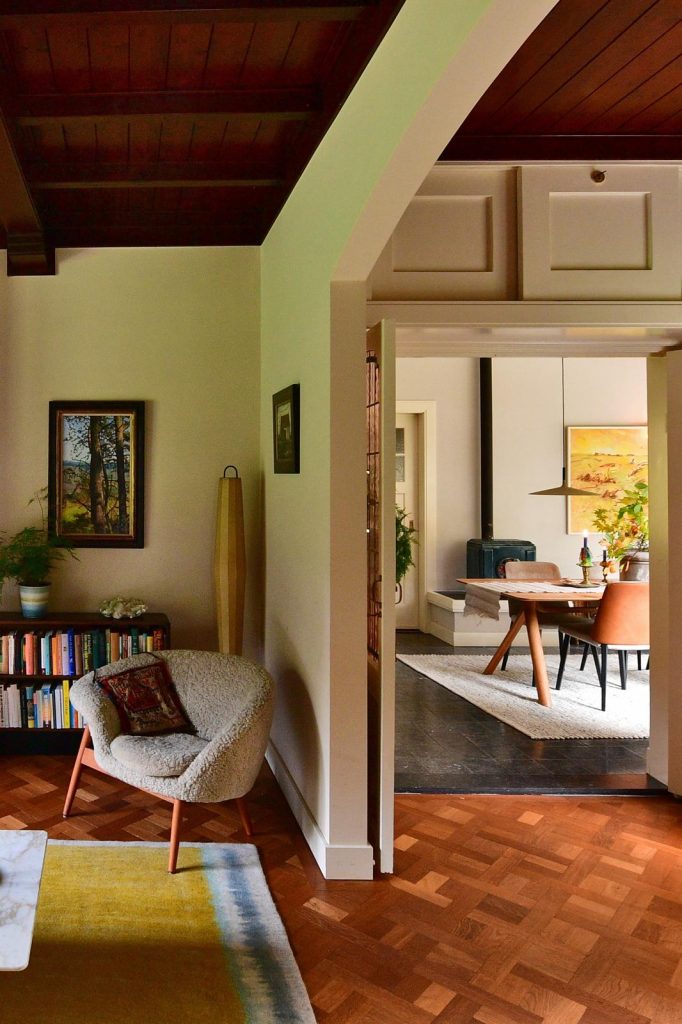 Voor de afwerking van het huis had het koppel geen vastomlijnd plan. “Dat is vrij spontaan gegaan. Ik kijk altijd goed om me heen en als ik iets zie wat ik mooi vind, ga ik eropaf. De eiken visgraatvloer bijvoorbeeld ontdekten we in een restaurant, via hen kwamen we bij de verkoper. Maar het had net zo goed een andere vloer kun- nen worden. We wisten wel dat we niet een heel modern interieur wilden, het moest in de buurt blijven van hoe het was en passen bij de omge- ving. Het is grappig om te zien dat binnen nu ongemerkt heel goed afgestemd is op buiten.” Dat zit ’m onder andere in de kleuren, zoals oker, ter- ra en de tinten van hout, die feilloos de kleuren reflecteren van het bos. Deze warme nuances vul- len het rustige verfpalet aan dat Barbera koos voor de basis in huis. “De verbouwing duurde een halfjaar, aan het eind kwam de schilder langs, welke kleuren we wilden? Geen idee, en ik was moe, dus het werden witten en neutralen als zacht grijsgroen. Daar kun je je nooit een buil aan vallen en zo was alles in elk geval lekker schoon geschilderd. Inmiddels zijn er leemverfachtige kleuren bij gekomen, meer uitgesproken, maar mooi natuurlijk.”