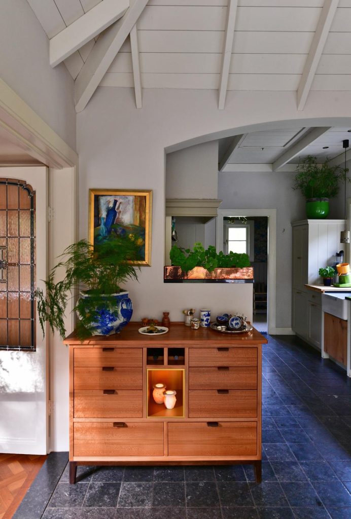 De inrichting van hun boshuis omschrijft Barbera als een ratjetoe. “Een beetje klassiek, maar ook strak en modern, een mix van vintage en nieuw, gekocht in woonwinkels maar ook in boerenschu- ren vol brocante. Ik vond het inrichten een moeizaam proces, moeilijker dan de verbouwing! Met al die vertrekjes hier is het schipperen met de ruimte, en meubels moeten praktisch, maar ook mooi zijn. De bank heeft wel op drie plekken gestaan voor het goed voelde, harmonieus.”Ook bij de aanschaf van spullen handelt Barbera intuïtief, soms impulsief. “Dat levert wel eens miskleunen op. Daarom vraag ik nu altijd of ik iets terug mag brengen. In Amsterdam gaat dat niet zomaar, hier in de Achterhoek zijn ze gelukkig niet zo moeilijk.”