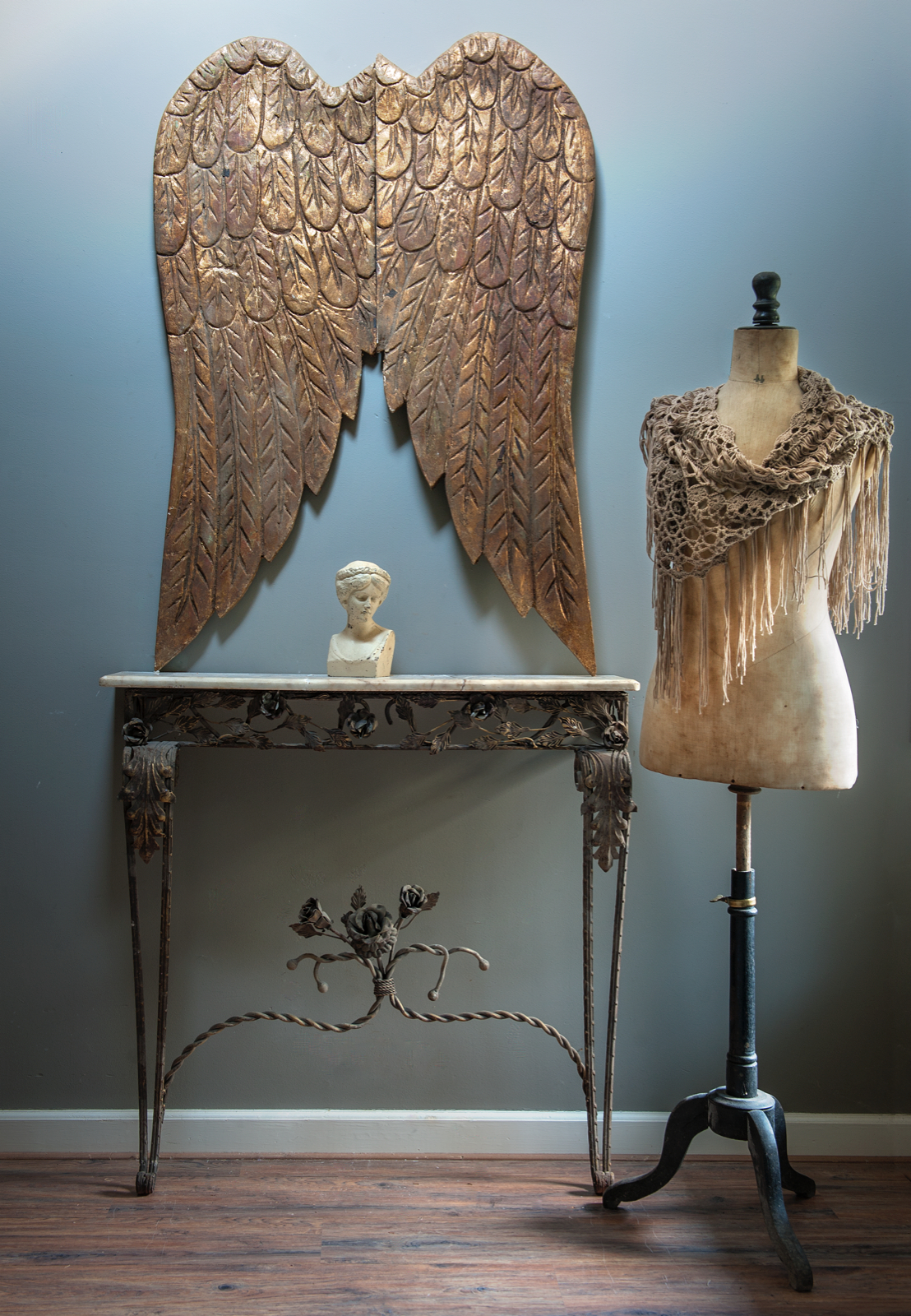 Landelijk antiek is een zwak van Kim: “Mijn ouders hebben hun stolpboerderij zelf gebouwd, met oude materialen die ze vonden bij handelaren en op veilingen. Ik ging als kind vaak met hen mee op speurtocht. De liefde voor oude spullen kreeg ik van jongs af aan mee.” Behalve enkele basisstukken als banken en bedden is vrijwel het hele interieur afkomstig van rommel- en brocantemarkten, antiekbeurzen en veilingen in België en Frankrijk. Ook putti – stenen kinderfiguurtjes – kan ze moeilijk weerstaan. Ze belanden vaak in huis, samen met andere geliefde tuinornamenten. En bij de eettafel kijkt een Frans borstbeeld op de borden, terwijl spelende putti naast de kast en op een piëdestal staan. Kleine stillevens trekken de aandacht, zoals een kralenketting rond een wandkandelaar. Over de bank ligt een bont gekleurde plaid; het zijn de accenten in roze en aqua die het grijs-beige interieur levendig maken. interieur  interieur TEKST MONIQUE VAN DER PAUW | FOTOGRAFIE TON BOUWER