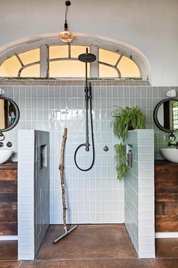De vloerwisser is een idee van Monique: de tak komt uit haar tuin en was afgebroken na een storm. De tegels komen van Tegelstee en de douchestang is van Hotbath.