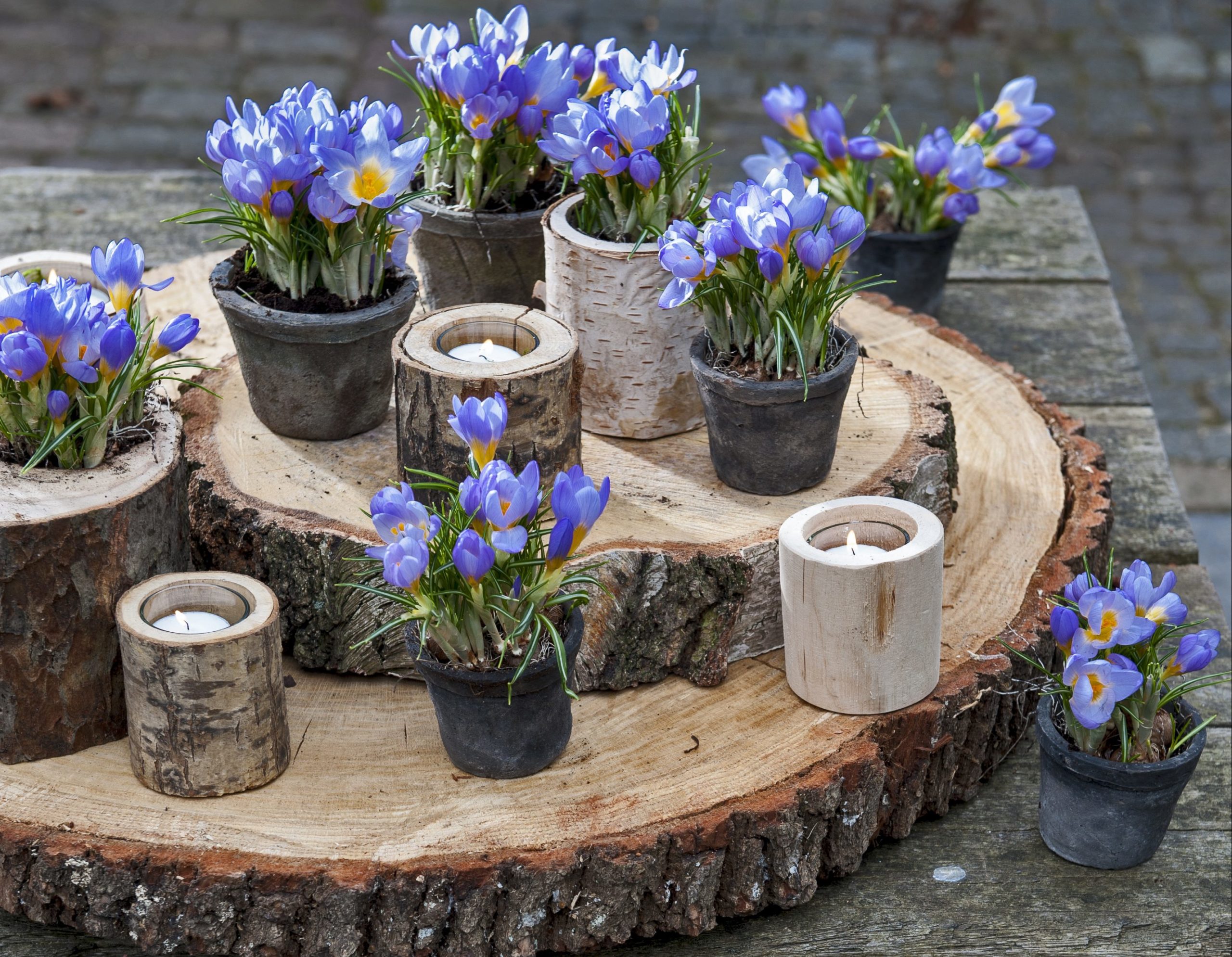 Een platte houten schijf fungeert hier als dienblad. Zet er krokussen in kleine potten op: een voorbode van de lente. Houten schijf (Tree Service Laren en Atelier ’82). Stronken (Atelier ’82). Krokussen (Plantenmarkt Boskoop). Potjes zijn privébezit.