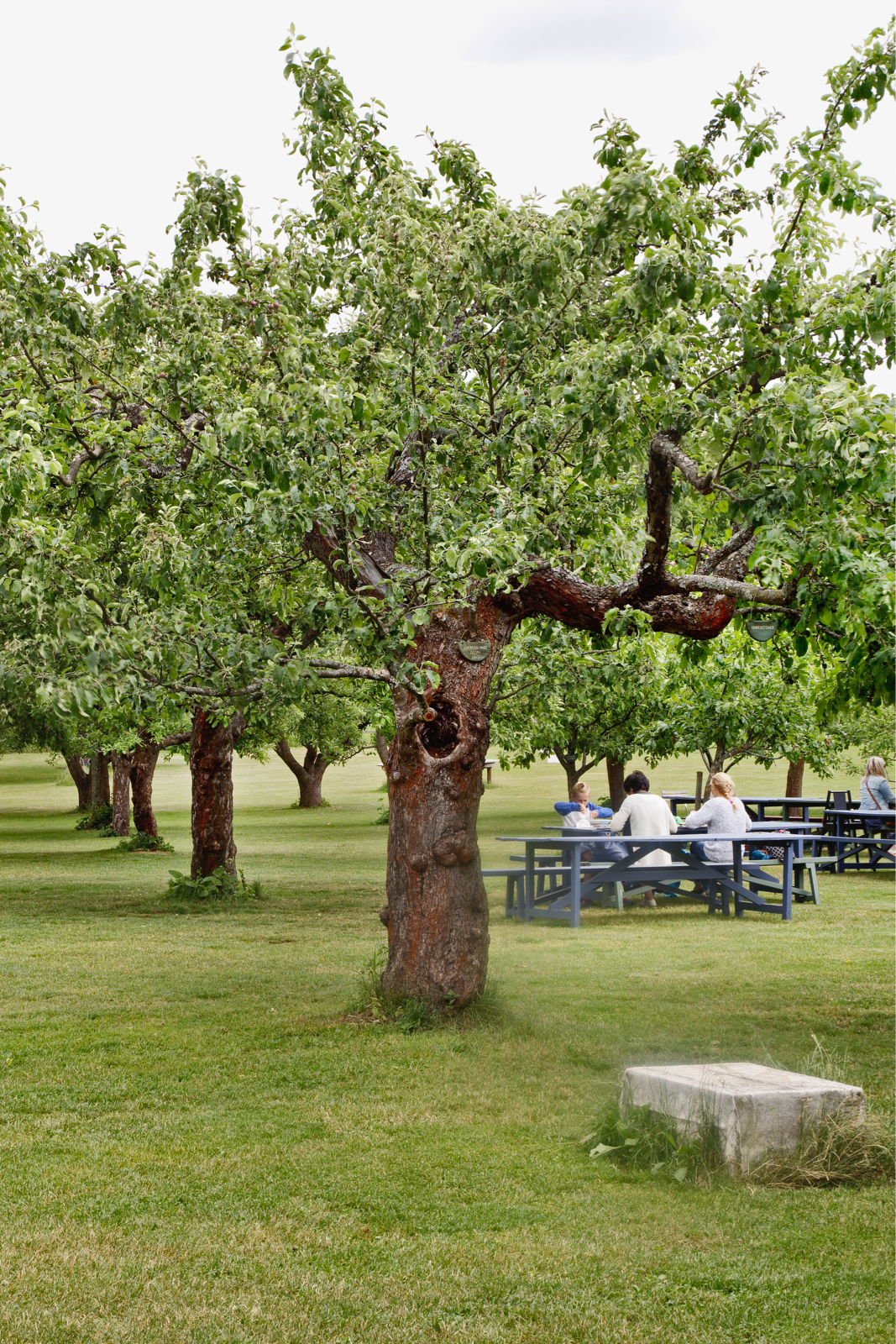 Zo op de vroege ochtend is er al veel bedrijvigheid op de lanen van het achtduizend vierkante meter grote park. Op de zware kleigrond zijn dit voorjaar tientallen soorten zomerbloemen gezaaid en gepoot. De groene waas die zich nu al vormt, belooft een zee van bloemen in augustus. Dahlia, Cosmea, zinnia: bezoekers mogen hun favorieten zelf afknippen en tot boeket laten binden. Vooralsnog plukken de bloemenmeisjes hier vooral onkruid. Maar aan kleur ontbreekt het geenszins; de borders van de kweekbedden staan al volop in bloei met geranium, Malva en donkerrode en witte pioenen. De allee tussen boomgaard en oude kassen is echt een visitekaartje. Tuinontwerpster Malin Skiöld maakt er elk jaar weer nieuwe, inspirerende beplantingsschema’s voor. De blauwe en paarse aren van kattenkruid en Salvia nemorosa vallen extra op tegen een ondergrond van roodbladige Ajuga en geranium. Donkerrode Cosmea, witbloeiende Allium en roze pijlen vingershoedskruid geven hoogte aan de borders. Aan de overkant knipt een van de medewerkers een bos margrieten, vrouwenmantel en Malva.