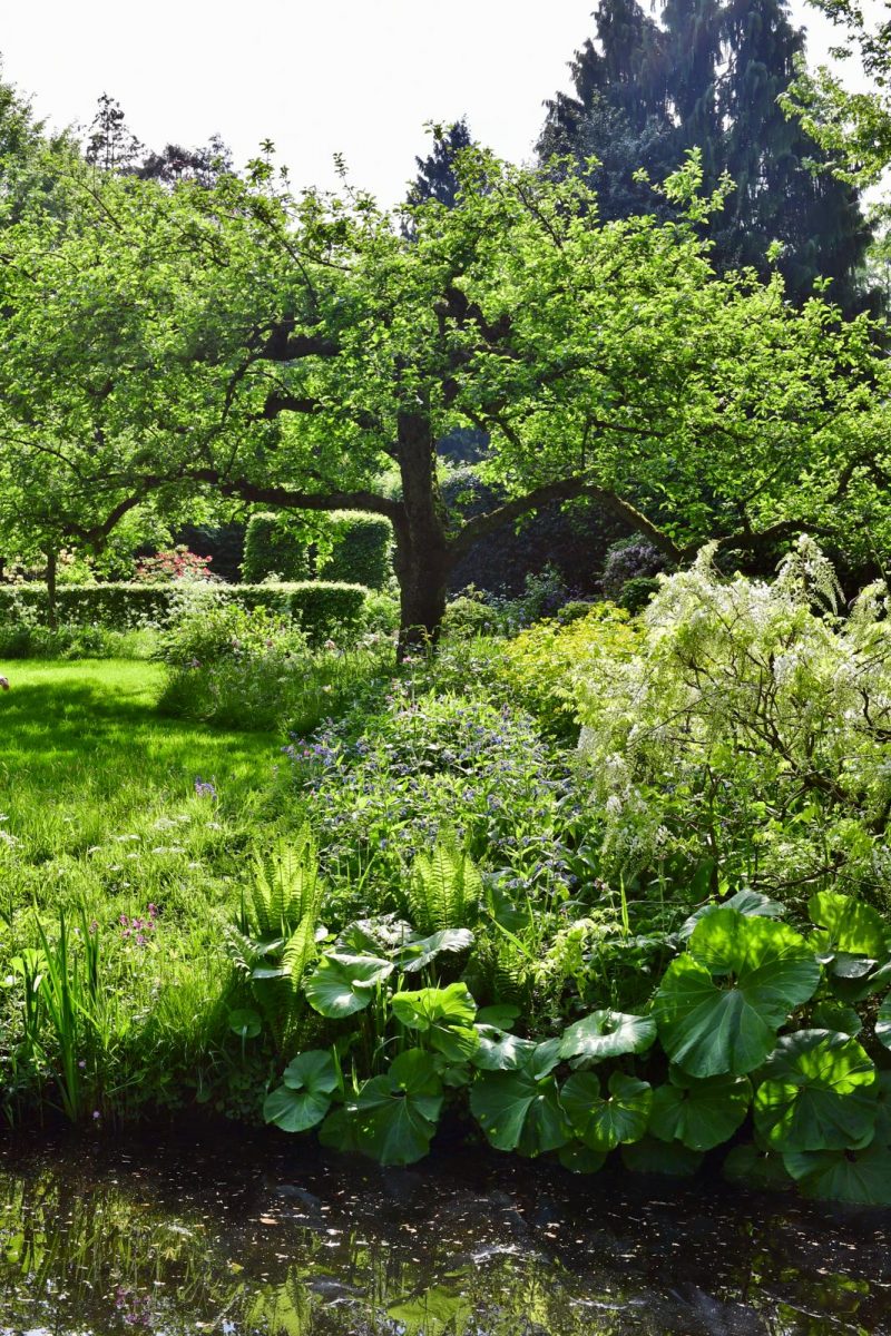Net als haar moeder tuiniert Djoeke op intuïtie en gevoel. Voor het grootste deel van de tuin bestaat geen ontwerptekening of beplantingsplan. “Ik probeer een gevoel van overdaad en kleur over te brengen. Geen knallende kleuren, maar wel veel en zacht, zodat het eruitziet als één grote bloemenzee.” Vooral in het voorjaar is dat een groot succes, als de bomen nog niet vol in het blad zitten en de planten veel licht krijgen. Wolken fluitenkruid en ruit, toefjes donkerrode tulpen en oranje nagelkruid, zachtroze clematis slingerend over een struik en warmgele smeerwortels die een schaduwrijke plek oplichten. Het is slechts een kleine greep uit de enorme rijkdom die de tuin biedt. Natuurlijk en een tikje ‘wild’, zonder dat het chaotisch of rommelig aandoet. “Ik treed op als een scheidsrechter”, aldus Djoeke. “Soms vind ik dat er een plant bij moet, dan haal ik iets anders weg. Echt op kleur sorteren doe ik niet. Vroeger hield ik niet van geel; tegenwoordig vind ik botergeel en groengeel erg mooi.” Djoeke heeft een voorkeur voor hoge vaste planten, stevige planten die niet snel omvallen. “Opbinden, daar hou ik niet van. Ook niet van die plakkaatvormende planten die na de bloei uiteenvallen zoals sommige asters. Floxen vind ik geweldig, met al die leuke kleuren. En ik hou van struikrozen. Die geven een mooi accent aan een border.” Eenjarigen en uitzaaiers komen er inprincipe niet in. Te veel werk, vindt Djoeke. Hoewel ze een zwak heeft voor springbalsemien. “Die mag eigenlijk niet meer, want het is een exoot die zich snel uitbreidt. Maar de bijen zijn er dol op.” Inheems of uitheems, het maakt Djoeke eigenlijk niet uit. “Ik probeer wel zoveel mogelijk planten te gebruiken waar bijen en vlinders ook iets aan hebben. Daarom zijn er hier vooral enkelvoudige bloemen, want daarop vinden ze makkelijker nectar. Bovendien vind ik die ook mooier, natuurlijker dan dubbele bloemen.” Strikt ecologisch tuiniert ze niet. “Natuurlijk gebruik ik geen gif, maar bij de keuze van planten houd ik er niet zo veel rekening mee. Er staan hier veel lindes, wilgen en kersen. Hun bloesem zorgt al voor massa’s stuifmeel. Dat merk ik aan onze eigen bijen; we hebben een paar bijenkasten in de tuin staan.” Lees ook: Zo maak je een bijenhotel – en meer tips om bijen te helpen