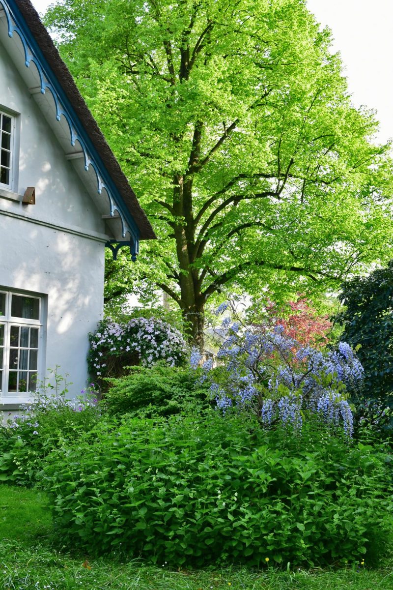 De villa staat midden op een licht aflopend grasveld, omsloten door golvende borders met struiken, rododendrons en weelderige vaste planten. Een mix van traditionele en natuurlijke beplanting. De rododendrons passen precies bij het klassieke beeld van een chic buitenverblijf. “Ze zijn nog door mijn opa geplant”, vertelt Djoeke. “Hij heeft ze begin vorige eeuw rondom het huis gezet. Vanuit mijn atelier kijk ik op vijf meter hoge exemplaren. Die horen hier gewoon.” Het contrast met de bloemenzee in de borders is groot en uitzonderlijk mooi. Djoeke houdt overduidelijk van een meer speelse, natuurlijke beplanting in de ronde borders die zo’n zestig jaar geleden zijn aangelegd door haar moeder. Zo heeft elke generatie hier zijn handtekening achtergelaten.