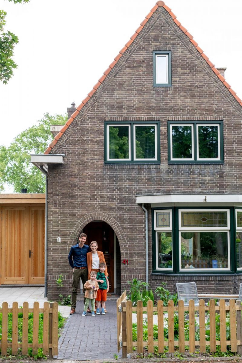 Uiteindelijk komt het hemelwater trouwens toch van pas. De tuin houdt zo veel mogelijk zelf de neerslag vast: weinig tegels en veel groen. Maar met de hete zomers is besproeien soms toch nodig. Vanaf nu kan dat vanuit onze eigen regenopslag. De regenpijp is gekoppeld aan twee tweedehands ibc-containers, voorheen gebruikt voor voedselopslag, nu goed voor een regenton van 2000 liter. Met een eenvoudige pomp en een tuinslang genoeg om acht keer de hele tuin van een frisse plens te voorzien. Fijn dat we daar geen drinkwater voor nodig hebben. CREDITS: PORTRET GEZIN LIZ GROEN / OVERIG: PRIVÉBEZIT
