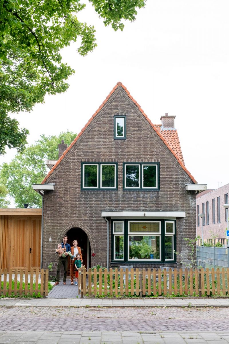 ‘Ons eerste koophuis is een fijne benedenwoning in de Haagse Bomenbuurt. De tuin is groter dan het vloeroppervlak. Meer buiten dan binnen leven we, gezellig met onze kippen Columbus, Plof en Scharrel in onze prairietuin. Elk jaar kijken we uit naar de bloei van onze goudenregen, de bloesem bedekt de hele tuin met gele confetti en honderden hommels zoemen in ons kleine paradijs. Onze woning willen we graag verduurzamen. Maar we maken deel uit van een enorme Vereniging van Eigenaren, dus voor elke ingreep moeten we het eens worden met 42 huiseigenaren. Gevolg: zeven jaar later liggen er nog steeds geen zonnepanelen op het dak. Onze jongens zijn net één en vier jaar oud als we besluiten dat het er nu maar eens van moet komen: we gaan een duurzaam huis regelen voor ons gezin. Een nieuwe woning lijkt de beste optie. Maximaal tien jaar oud, dan krijg je een goed energielabel erbij cadeau. Dus daar gaan we – van Madestein tot Berkel en Rodenrijs; in een paar weken tijd bezichtigen we vijftien huizen in en rondom Den Haag. Voordeel van nieuwbouw: je kunt er zo in, best fijn met twee kleine kinderen en wij ieder een volle werkweek. Maar we worden maar niet enthousiast, er is geen enkel huis waar we onszelf in zien wonen. Binnen is doorgaans alles van plastic, van deurpost tot witte hoogglanskeuken. Buiten missen we het groen en onze goudenregen. Vaak is de hele tuin bedekt met tegels, met een beetje ‘geluk’ groeit er wat bamboe of ligt er een homogeen groen gazon.