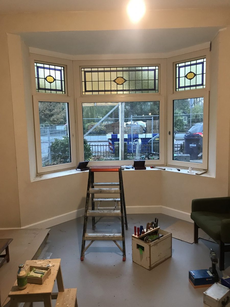 En het glas-in-lood? Dat is er heel voorzichtig uitgehaald. Een familiebedrijf knapt ze ruitje voor ruitje op. Alle stukjes worden losgehaald en schoongemaakt. Daarna is het ontwerp op schaal verkleind, van elk stukje glas is een randje af. Goed geïsoleerde kozijnen zijn breder, dus er is iets minder ruimte. Daarna zetten ze het oude glas in nieuw lood. Door het te patineren gaat dat lood van glimmend zilver tot dof grijs, alsof het er altijd al was. Ingepakt tussen twee glasplaten plaatsen ze het zorgvuldig weer in het nieuwe kozijn. Een investering waar we dagelijks blij mee zijn. Geen kou langs de ramen en geluidsdicht. De gordijnen bewegen alleen nog als het raam openstaat. En hoera, dat prachtige glas is in ere hersteld, op naar de volgende 100 jaar! glas-in-lood