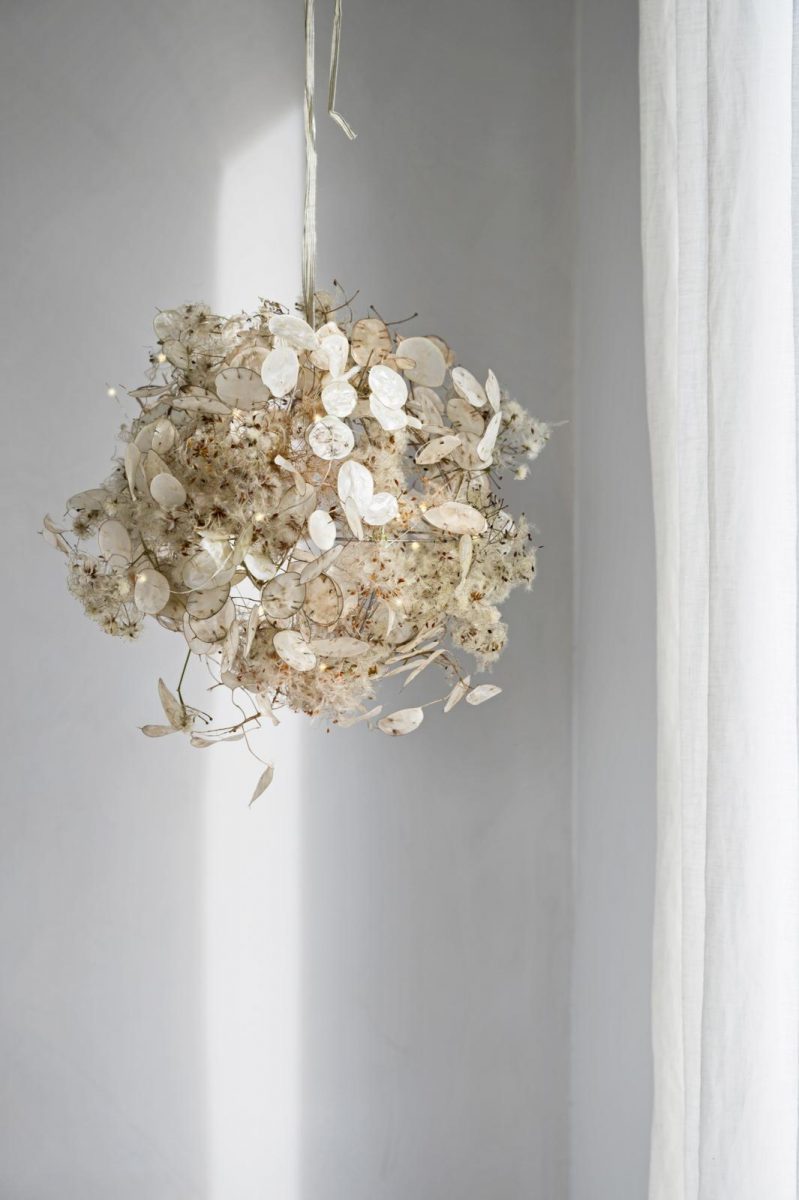 Alsof het zachtjes begint te sneeuwen…Deze feeërieke kerststukjes maak je met gedroogde judaspenning en de ranken van een clematis met wollige zaadpluizen. Zo creëer je zelf die verstilde sfeer van vallende vlokken. Pure magie, toch? Veel te mooi ook om na kerst weer weg te halen, ze passen ook perfect bij de mooie woonkleuren van 2022. Dus geniet er gewoon de winter lang van!