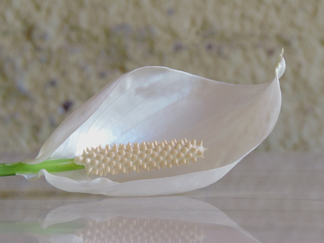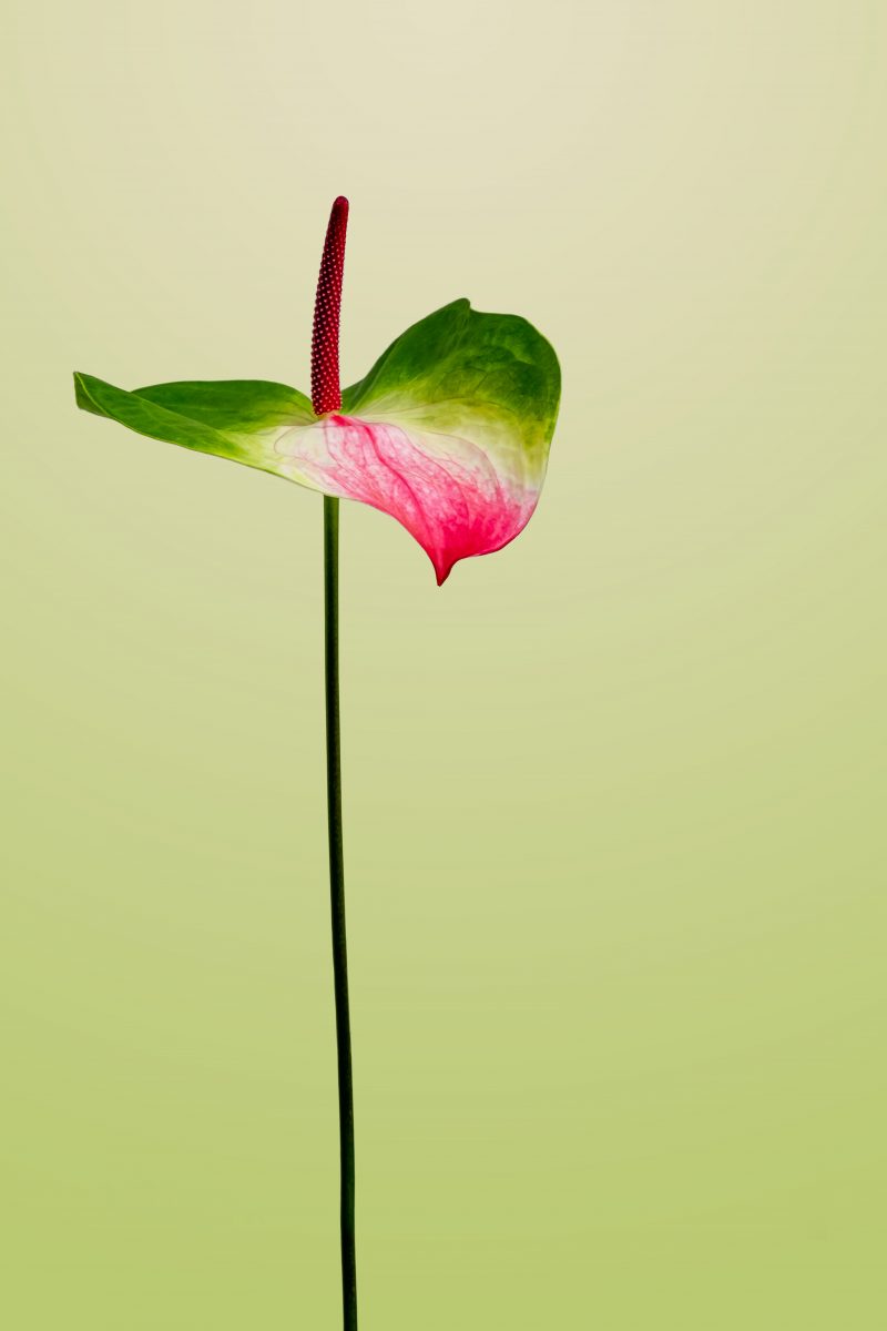 Veel planten bloeien eens per jaar. De Anthurium bloeit maandenlang, meerdere keren per jaar. Het zijn trouwens niet de bloemen die zo mooi kleuren, maar de schutbladeren. Uit elk schutblad komt de bloemkolf tevoorschijn – die dunne stengel die lijkt op een sigaartje. Daarop zitten kleine bobbeltjes, en dat zijn de echte bloemen. En die zijn minuscuul: zo’n 3 millimeter. Fijn dus dat ze zo’n groot sterk schutblad hebben ter bescherming.