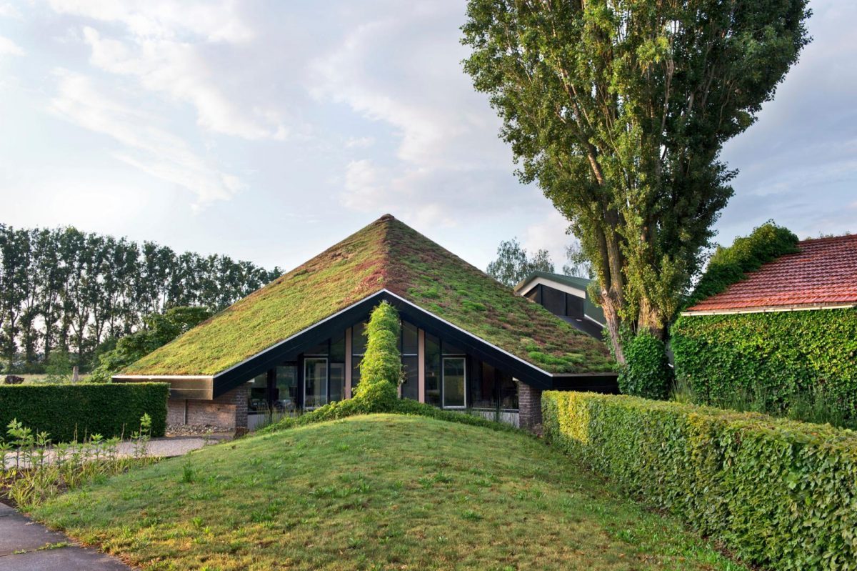 Het tuinontwerpkantoor kreeg een groen sedumdak. Zo gaat het mooi op in het landschap.