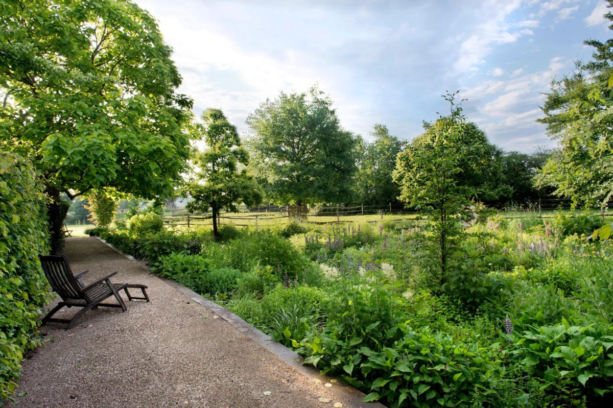 De drie hectare grond rond zijn boerderij is voor Nico één grote proeftuin. In fases ontwikkelde hij hier samen met echtgenote Yvonne verrassende tuinkamers en landschapselementen. Zoals de prairieachtige tuin aan de zijkant van de boerderij. Aanvankelijk zaaide hij hier, deels vanuit tijdgebrek, een wilde-bloemenweide. Tot het veranderende klimaat hem tien jaar geleden inspireerde om te experimenteren met lavasplit. “De grond is hier gemengd met Prairieva. Deze korrels houden vocht goed vast. Op de hoge delen staan allerlei planten door elkaar, waaronder veel akelei, ridderspoor en Epimedium, waar ik dol op ben. De lagere, nattere delen zijn ingeplant met soorten die daar goed aarden, zoals leverkruid en asters. Zo kan deze tuin zichzelf bedruipen.” Nico beplantte de borders ritmisch door steeds groepen te herhalen. Graspaden meanderen erdoorheen als gemaaide paden in een bloemenwei. Rustpunten zijn hier enkele solitaire bomen, waaronder een linde en kastanje.