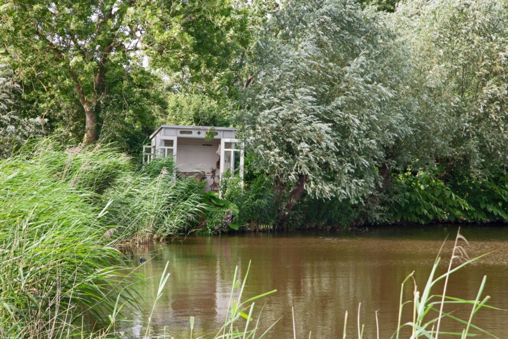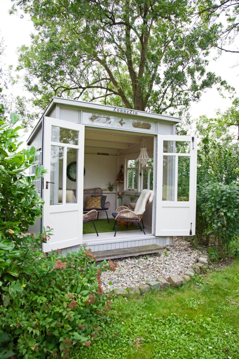 Achter in de tuin, tegen de boerenakker aan, staat het schattige tuinhuisje, met aan de voorkant grote ramen in de openslaande deuren. De zachtgroene kleur loopt over in het groen van de tuin en de wilgen die langs de sloot van de akker staan. “We wilden veel meer kunnen genieten van buiten zitten. Eerder in het voorjaar, later in het najaar en ook wilden we in de tuin kunnen zitten als het waait, en dat doet het best vaak hier”, vertelt Wim. Dat je het huisje kunt draaien was helemaal een fantastische bonus. “Zo kijken we het ene moment over het weidse Groninger landschap en het volgende moment zitten we intiem en beschut.” Wim geeft het huisje een flinke duw en duwt het rond tot het uitzicht in tegenovergestelde richting is. “We gebruiken het huisje vaak om ’s ochtends in het zonnetje in te ontbijten, de krant te lezen en koffie te drinken. Ook lunchen we er regelmatig. In de zomer als het warm is draaien we het huisje vaak uit de zon om zo in de schaduw te kunnen zitten.” Wim en Jacquelines huisje gaat op in het landschap, alsof het er altijd gestaan heeft.