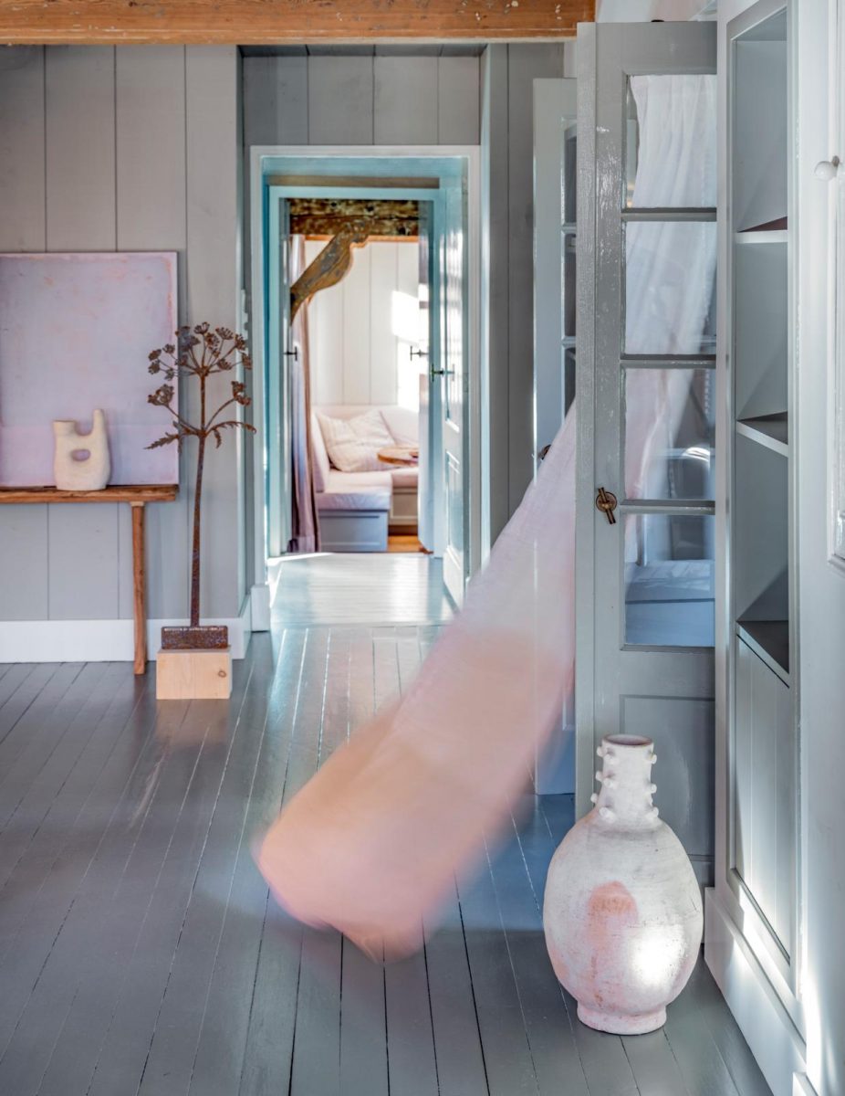Shopping gordijnen: Schilderij € 350 (nettydegroot.nl). Aardewerken Tamegroute vazen, met gat € 109, vaas op vloer € 195 (householdhardware.nl). Hogweed (berenklauw) sculptuur van cortenstaal, 130 cm hoog, gaat buiten oxideren, Studio Divers, € 132,95 (abeltosh.com).
