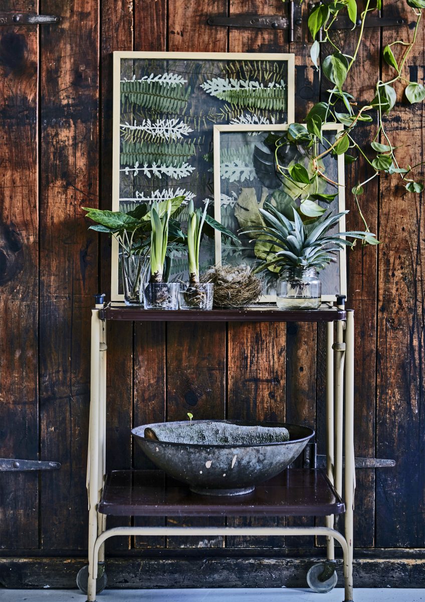 Altijd mooi: een hoekje waar je uiteenlopende natuurvondsten verzamelt. Mix kamerplanten met je zelfgemaakte creaties achter glas. Het nog persoonlijker maken? Speur op antiekmarkten of websites naar oude medaillons met gedroogde bloemen. In het victoriaanse tijdperk was het drogen van bloemen b(l)ooming business, de sieraden waren bedoeld voor het nageslacht. De gelukkige vinder van zo’n prachtstuk? Geef hem een eervol tweede leven, bijvoorbeeld onder een glazen stolp in je groen gestylede hoekje.