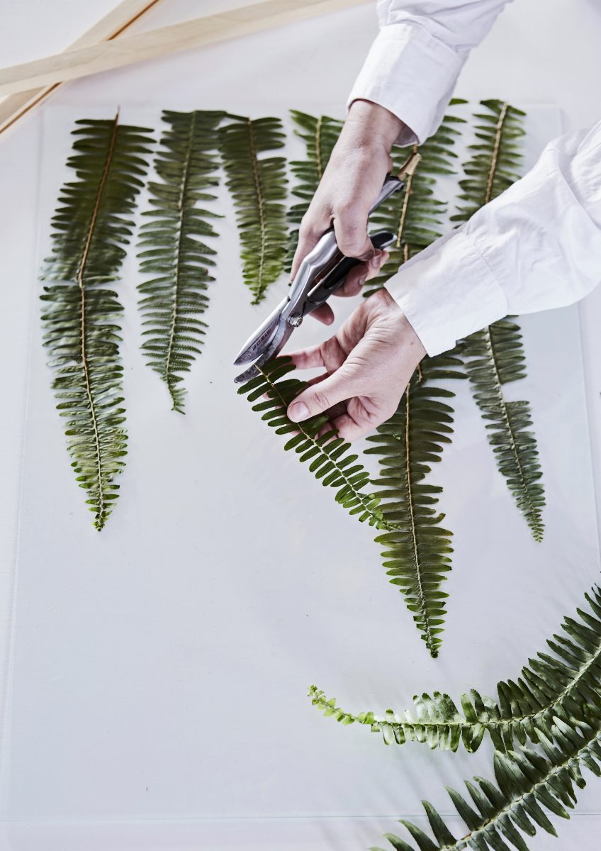 Welke bladeren zijn geschikt om in te lijsten? De beste zijn diegene met een uitgesproken grafische vorm. Denk aan Oost-Indische kers, varens en de gatenplant (Monstera). Er zijn geen harde regels bij het decoreren. In een compositie kun je spelen met diverse vormen, maar ook in zijn eentje steelt een blad de show. Maak het jezelf vooral niet te moeilijk en laat je leiden door de beauty’s in je buurt. Een kamerplant als Philodendron doet het bijvoorbeeld ook perfect achter glas.
