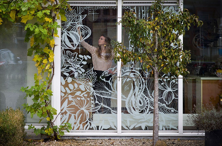 - Vervolgens plak je de tekening aan de buitenkant op het raam. Vervolgens trek je met een krijtstift (bijvoorbeeld in wit of goud) de raamtekening over. Haal de papieren versie aan de buitenkant weg, en er komt een prachtige tekening tevoorschijn.