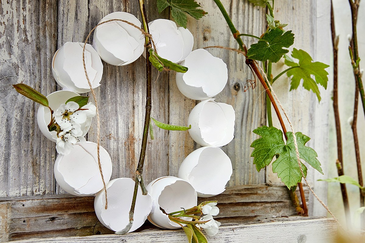 Tip: Leg de paaskrans plat op een mooi gedekte tafel met een beetje water in de eierschalen zodat je er verse bloemen in kunt leggen.