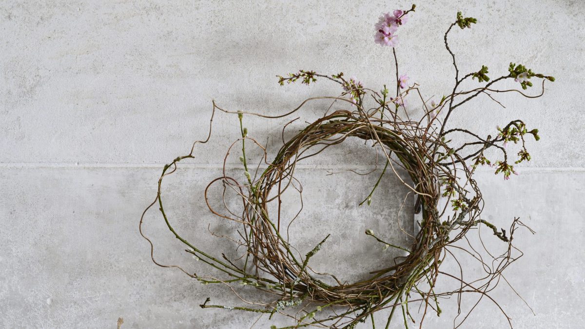 Een strak gevlochten krans is keurig, maar statisch, terwijl dit springerige exemplaar met wilde takjes bijna lijkt te roteren van plezier. En dankzij een slim verborgen vaasje blijft de bloesem zo lang mogelijk mooi.
