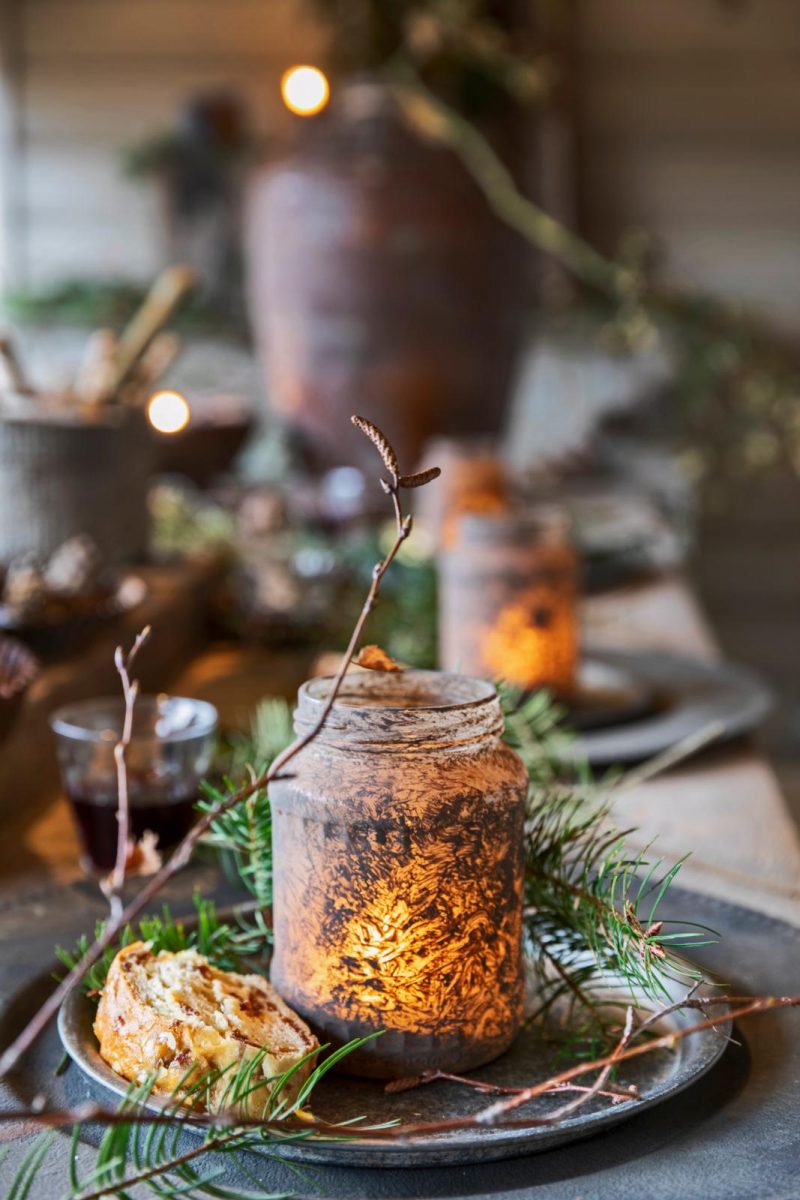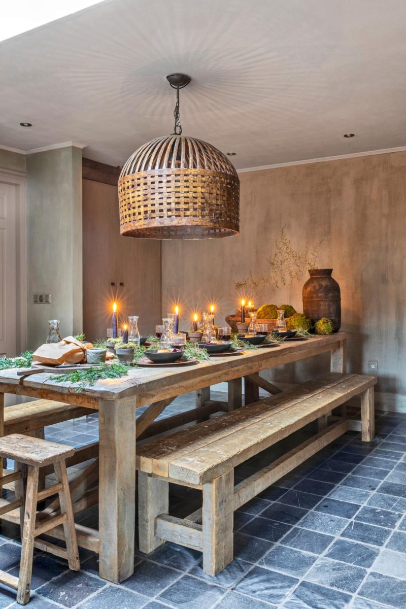 Over oude potten gesproken; overal in Tanya’s huis staan schalen, kruiken, kommen en vijzels van hout met groeven, gaatjes en scheuren die oorspronkelijk uit Nepal, Indonesië, China of India komen. “Ze zijn vooral gebruikt voor het bewaren, bereiden en vervoeren van voedsel. Ik zet er bijvoorbeeld takken van onze berkenboom in, maar ze doen het ook goed als groepje bij elkaar. Dan wordt het een echte eyecatcher.” En dan is er nog dat magische spul waar Tanya niet zonder kan als het om decoreren gaat: krijtverf van Annie Sloan. “Heel geschikt om oude, donkerbruine kastjes met een dikke boenlaag te transformeren tot eigentijds meubelstuk. Er hoeft niet eerst geschuurd en gegrond te worden, deze verf zet je er zo op. Daarnaast kun je ’m ook gebruiken om accessoires te ‘vergrijzen’ – zoals de kaarslichtjampotten – of om kunststof onderborden, die je vaak voor een prikje bij de kringloop koopt, een ‘zinken’ look te geven óf om oude kerstballen een ‘roestig’ jasje te geven. Dat laatste doe ik met krijtverf, wax en wat vogelzand.”