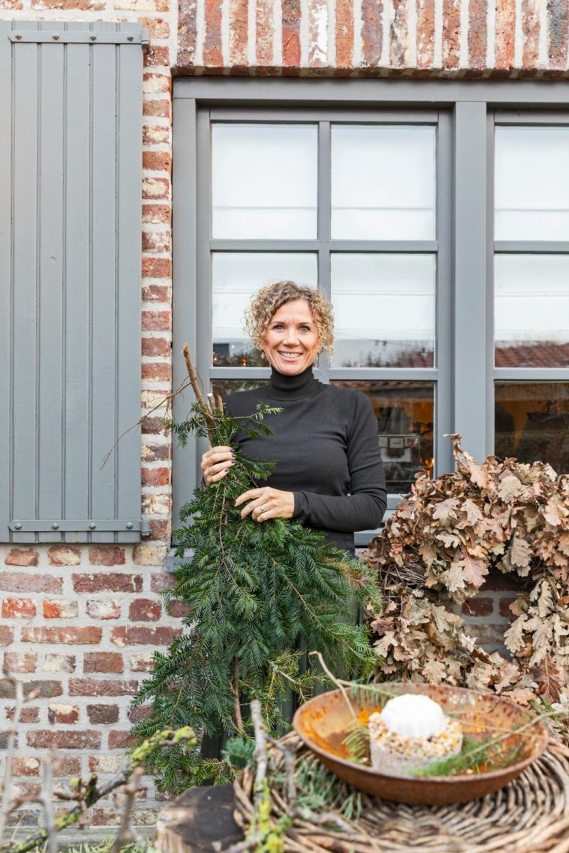 Ook de inrichting heeft de afgelopen twintig jaar een metamorfose ondergaan. “Jarenlang was ik fan van de Engelse stijl: donkere houten vloeren, Laura Ashley-behang met rozen, Schotse ruiten en veel brocante. Zo vol en druk als het hier ooit was, zo sober probeer ik het nu te krijgen. Het hoeft allemaal niet zo netjes en gelikt. Doorleefd hout, het sleetse van oude verf, kalkverf op de muren dat geen egaal resultaat geeft maar juist een nonchalante uitstraling heeft, en kreukelig linnen past nu beter bij me. Ik hou van natuurlijke materialen.” Een nep kerstboom of kunsttakken zul je bij Tanya dan ook niet aantreffen. “Als grote boom kies ik vrijwel altijd een Nordmann omdat die mooie volle takken heeft en weinig naalden verliest. Daarnaast vind ik het leuk om toefen kerstgroen te maken. Ik haal die takken niet uit het bos, maar vraag altijd aan de kerstboomverkoper of hij nog een kneusje in de aanbieding heeft: eentje die niet helemaal recht is of hier en daar wat kaler. Die koop ik dan om z’n takken.” De bosjes groen hangt ze losjes op aan de deuren en buitenpoorten of ze drapeert wat takken over een hanglamp. “Met wat binddraad kun je er hier en daar wat dennenappels aan bevestigen, maar zonder is zeker zo mooi.”