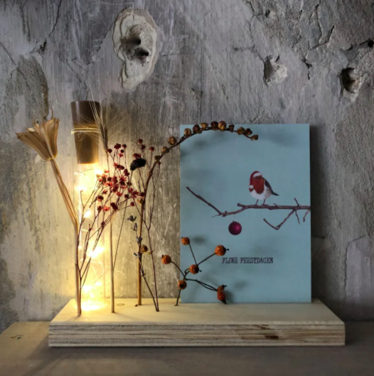 Een plankje met daarin wat gaatjes en een gleufje. Voor een reageerbuisje met lichtjes erin, wat van je lievelings (droog)bloemen en die ene kaart of foto. Simpel concept, groot effect. Je kunt de kunst afkijken bij het inspirerende label Mooi van ver, of ‘m daar kant en klaar bestellen voor € 13,95.