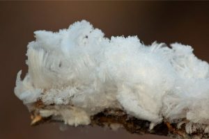 Levenstekens zijn niet te bespeuren. Het bos bij Vierhouten is na een ijskoude nacht met tien graden vorst in de ban van de winter. De beuken zijn wit uitgeslagen. Het bruine beukenblad op de bosbodem is bepoederd met rijp. Op en naast het wandelpad liggen plassen met ijs vol fascinerende kronkelpatronen. Hier en daar kun je zelfs een dode tak zien liggen met daarop ijshaar (A), een sprookjesachtig winterverschijnsel dat op dood en nat hout van loofbomen is te zien. Het ontstaat wanneer de temperatuur van de lucht onder het vriespunt ligt en de luchtvochtigheid hoog is. Door de stofwisseling van schimmels in het hout komt water vrij dat door kleine openingen in het hout naar buiten wordt geperst, waar het vervolgens bevriest. Zo ontstaan lange dunne ijshaartjes, ook wel de baard van Koning Winter genoemd. IJshaar is teer. Pak een tak met ijshaar op en het brokkelt vrijwel meteen af.   natuurommetje