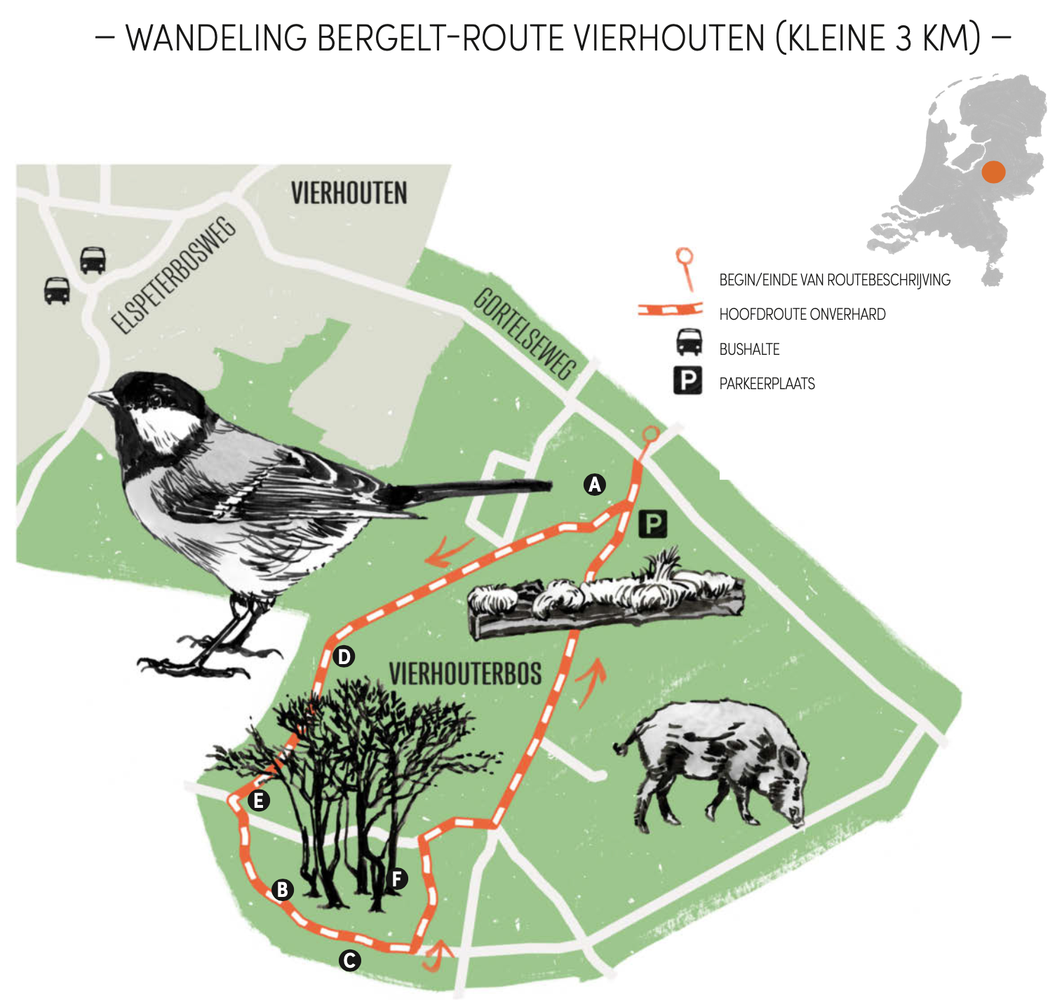 Alles kraakt en knispert onder de wandelschoenen: de bevroren aarde van het wandelpad, de dorre boombladeren die stijf bevroren breken en het ijs dat in de oude karrensporen (B) op het pad ligt. Die bevroren plassen (C) zijn kunstwerken op de bosbodem. In sommige plassen ligt een laag verdord blad met daarover een ijslaag. Als de zon tussen de bomen door piept en goud licht begint uit te strooien, is het alsof je in het Rijksmuseum naar het werk van een oude meester kijkt waarin donker en licht de hoofdrol opeisen. Stop je met wandelen, dan lossen alle geluiden op en is het ijzingwekkend stil. En voor het eerst beweegt er iets in het bos: koolmezen (D) vliegen zenuwachtig van boom naar boom. Onder die bomen waarin ze van tak naar tak huppen, ligt een heuvel, een enorme witte molshoop in het bos. Het blijkt een grafheuvel (E) die dateert uit de bronstijd. Op een stenen zuil staat dat in de late bronstijd (1100 v.Chr.) crematieresten zijn bijgezet in deze grafheuvel. Als wandelaar probeer je je iets van zo’n tafereel voor te stellen, maar het blijft een mistig gegeven op de tijdsbalk. wandeling