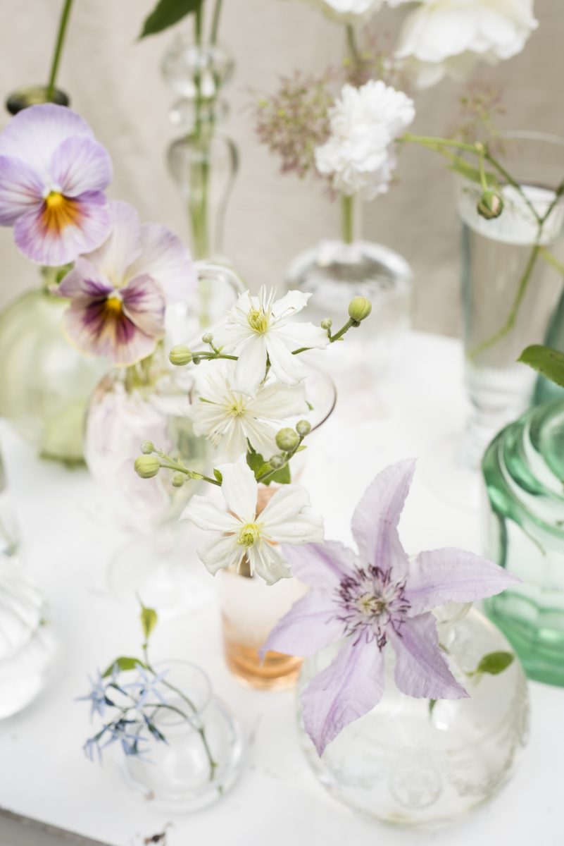 Op de foto hierboven een tiental transparante elegante vaasjes, elk gevuld met een solitaire bloem. Het resultaat: een feeëriek stilleven. Je kunt natuurlijk de bloemen kiezen die je zelf het mooist vindt. Wij zijn gecharmeerd van deze solisten (van links naar rechts):