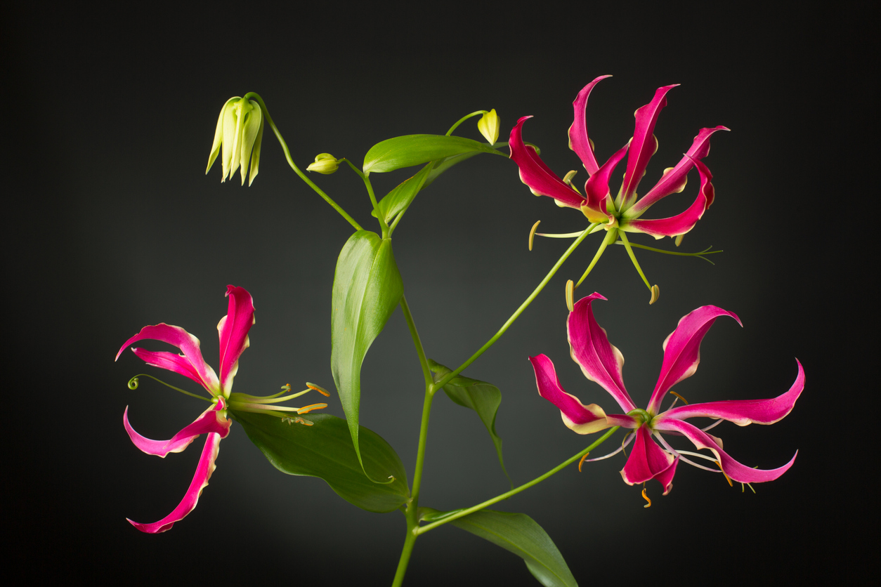 Fragiele kleurrijke bloemen met ‘a touch of yellow‘, op ranke diepgroene stelen. Gloriosa is een schoonheid, als enkeling op een vaas of als kamer- of terrasplant. Wist je dat ze in meer kleuren komt dan alleen in rood?