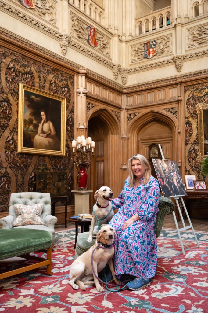 we allemaal kennen van de serie en de films: Downton Abbey, pardon, Highclere Castle ligt als een statig schip in een oceaan van groen. Terwijl we in stille bewondering naar het huis staren, gaat de metershoge houten deur lang­ zaam open. Er verschijnt echter geen butler – type Carson – of een moderne versie van hem; van een stoet ontvan­gend personeel is anno 2025 duidelijk geen sprake. Lady Carnarvon stapt met twee jonge labradors op ons af en begroet ons met een gulle lach. “Indrukwek­kend, hè? Jullie zien het nu terwijl alles in bloei staat, ik zag het voor het eerst op een druilerige ochtend in november, maar ik kan je verzekeren dat ik ook zwaar onder de indruk was. Mijn schoonouders hebben er nooit echt gewoond; ze gebruikten het als locatie voor feesten en bijeenkomsten.”