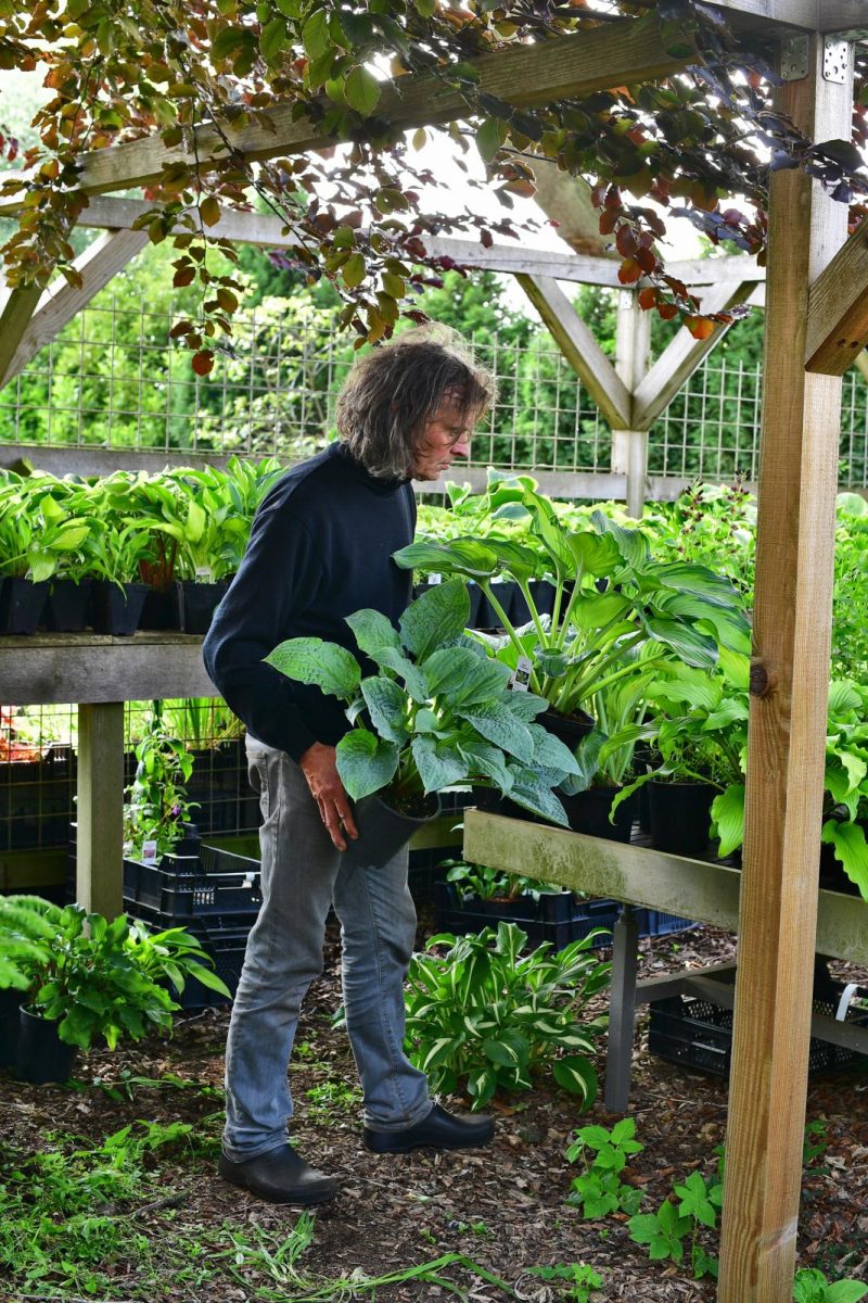 In de eerste anderhalve maand van het jaar gaat Gerrie alle potten langs met een oplossing van twintig liter water en een liter ammoniak. Op die manier verbranden de slakkeneitjes die in de potten zijn gelegd. Maar ook de larven van de taxuskever, een opkomende plaag. “Om die reden heb ik hier bijna geen Heuchera’s en Heucherella’s meer staan. De larven knagen de wortels volledig door. Vaak trek je die planten zo uit hun potjes. Dat doen ze helaas ook bij de steenbreek (Saxifraga), een leuke schaduwplant. En bij fuchsia’s in pot.” In de hosta-zee staan echte zeldzaamheden. Zoals streaker ‘Poison Dart Frog’ met vanillekleurige penseelstreken. Of ‘Generation X’, een opvallende blauwe, gebobbelde hosta. “Tegenwoordig worden de meeste hosta’s in het laboratorium via weefselkweek vermeerderd. Voor de echte verzamelaar zijn die planten niet interessant. Maar zo’n ‘Generation X’ komt uit ‘original stock’ van een Amerikaanse kweker. Als je hem wilt kopen, wordt hij ter plekke voor je uitgestoken. Zo weet je zeker dat je een unieke plant hebt.” Ook Gerrie verkoopt regelmatig een ‘neus’ van zijn eigen moederplanten. “De ruimte hier is beperkt, dus het komt voor dat mensen een plant aanwijzen die ik niet op voorraad heb. Ik vind het leuk om op die manier met klanten over de kwekerij te lopen. Altijd mooi om te zien als ze helemaal blij met hun plantjes naar huis gaan.”