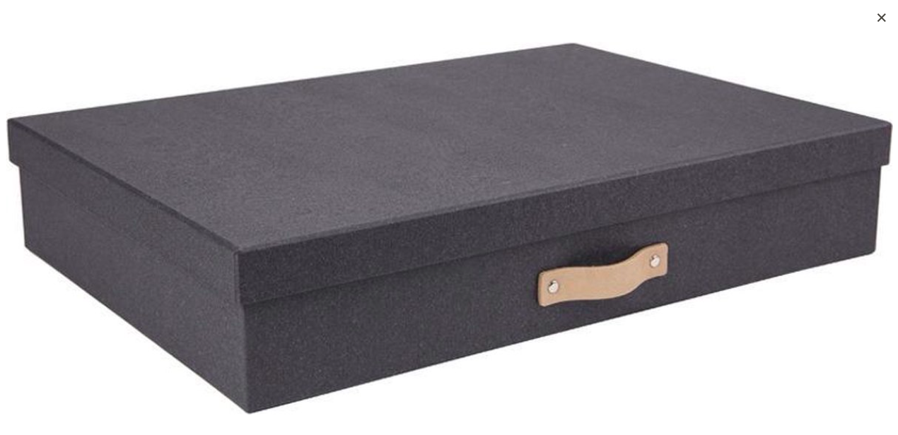 Handig formaatje – bijvoorbeeld om je laptop uit het zicht in op te bergen. Hij is van karton, met een handvat. 31L x 43,5B x 8,5H cm | € 30,17 | bol.com