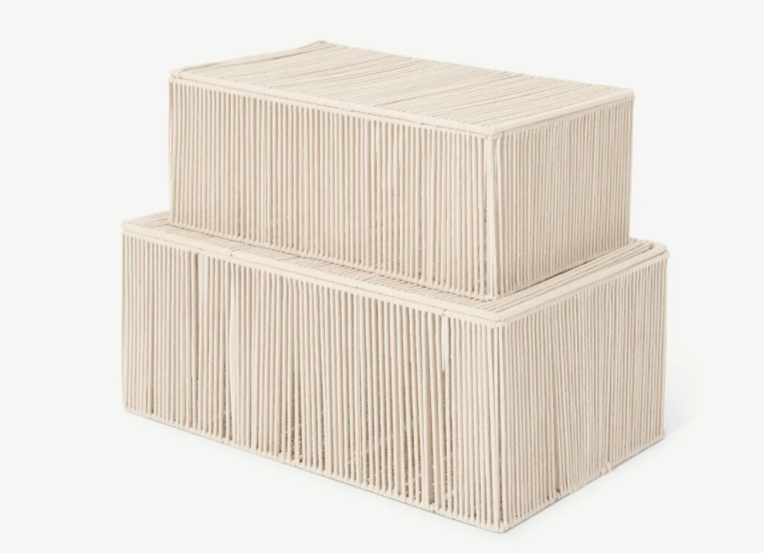Dit ‘Holgate’ setje van made.com is gemaakt van touw. Rest de vraag, ga je voor wit of zwart – of voor allebei? 42B x 28H x 68D cm (de grootste) | € 69 | made.com