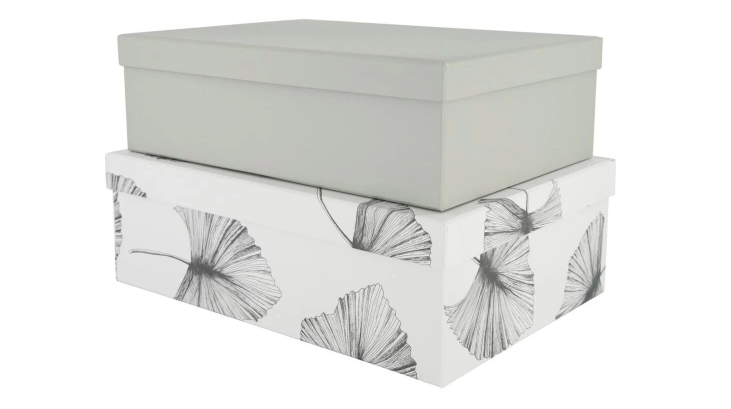 De één zachtgroen, de ander wit met een print van bladeren. Knap en fijn geprijsd Hema-duo, als je het ons vraagt. 23,5 x 32,5 x 11 cm (met print) & 22 x 31 x 9,5 cm (lichtgroen) | € 8 | hema.nl
