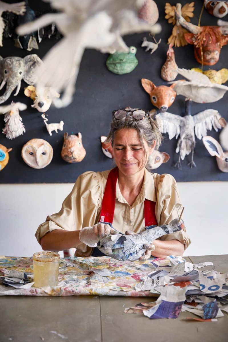 “Sinds vorig jaar word ik door de belastingdienst officieel als ‘kunstenaar’ beschouwd. Dat voelde voor mij als een diploma. Ik neem mezelf nu serieus, vind dat ik een kunstenaar ben. Daarvoor beschouwde ik mezelf meer als een mama-met- een-hobby. Papier-maché wordt nog weleens onderschat. Als ik het mensen vertel, krijg ik vaak te horen: ‘Heb ik ook weleens gedaan. Dat is niet zo moeilijk’. Maar het verenigt twee disciplines die best pittig zijn, namelijk het bouwen van vormen en schilderen. De kunst is om ze allebei te beheersen. Daarin heb ik flinke stappen gezet. Mijn eerste klanten hingen mijn werk vaak in de kinderkamer. Tegenwoordig ben ik ‘woonkamerfähig’, merk ik.”