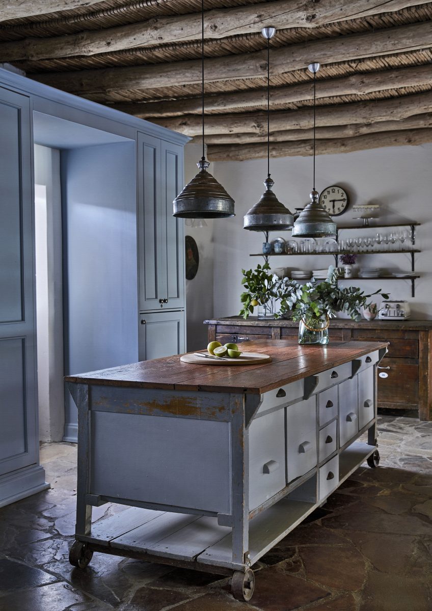 Vanaf het begin wist Charlotte – die vóórdat ze de overstap naar interieurontwerper maakte werkzaam was als stylist op film- en reclamesets – welke look-and-feel elke ruimte moest krijgen. Geborgen, met respect voor het verleden, maar ook een knipoog naar nu. En dankzij haar vroegere ervaring in het vinden van de juiste rekwisieten beschikte ze over een zwart boekje met dé adressen voor bijzondere schatten. Zoals Onsite Gallery in Kaapstad (zie @onsitegallery), waar ze haar salontafel vond: een oude kruiwagen met daarbovenop een glazen plaat. “Ik heb altijd een zwak gehad voor items met een geschiedenis. Niet alleen vanwege het vakmanschap, spullen werden vroeger gewoon veel beter gemaakt, maar ook omdat ik het heerlijk vind om erover na te denken van wie het geweest is, en hoe die persoon ermee omging.” Ze is dan ook een trouwe klant van Milnerton Market, een van de beroemdste weekendvlooienmarkten van Kaapstad, waar ze een deel van de vintage portretten vond die nu in het trappenhuis hangen.