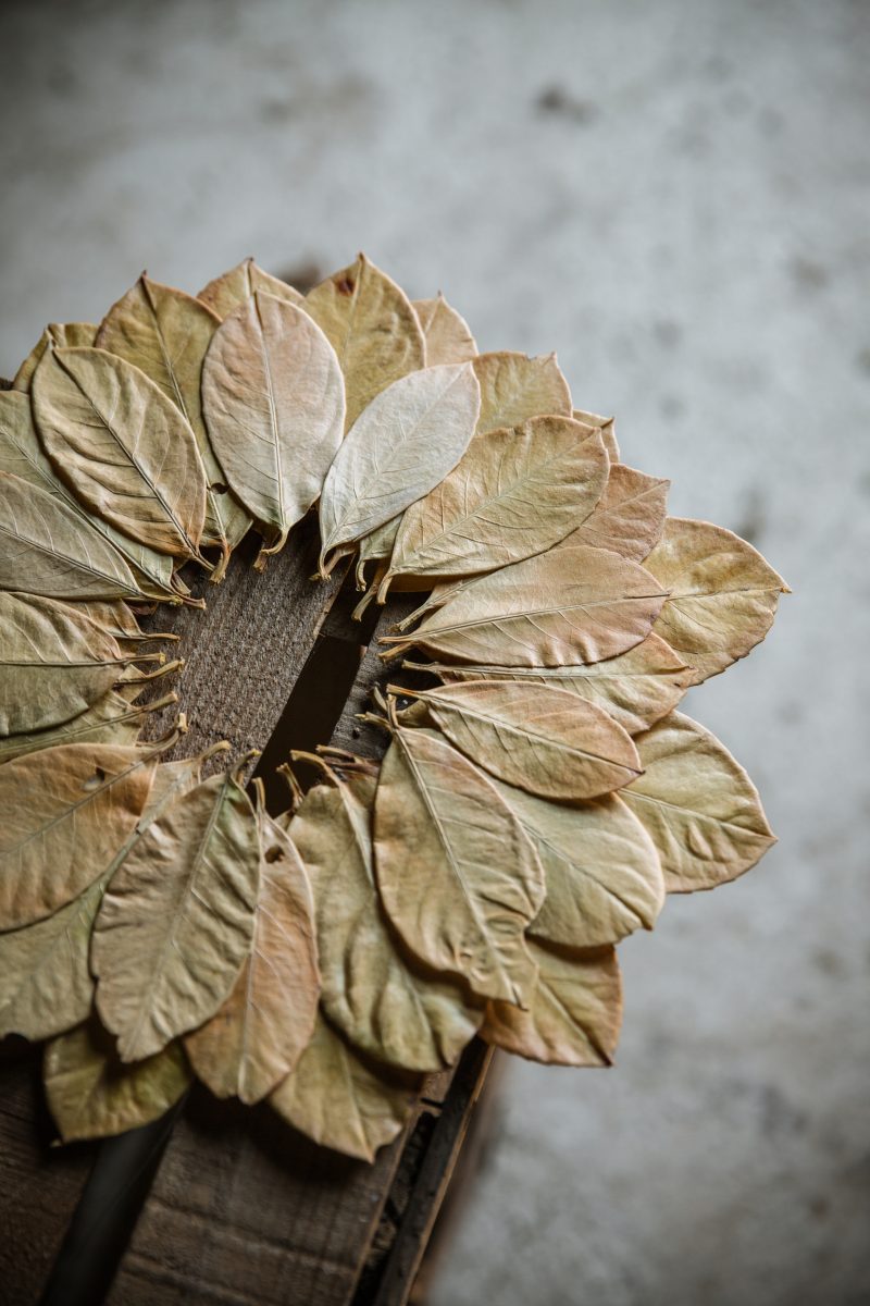 De meeste droogbloemen zorgen voor losse, nonchalante boeketten, maar laurierblaadjes zijn juist plat en strak van vorm, ook als ze gedroogd zijn. Ideaal dus voor een laurierster: een lieflijke kleine krans van gedroogde laurierblaadjes.
